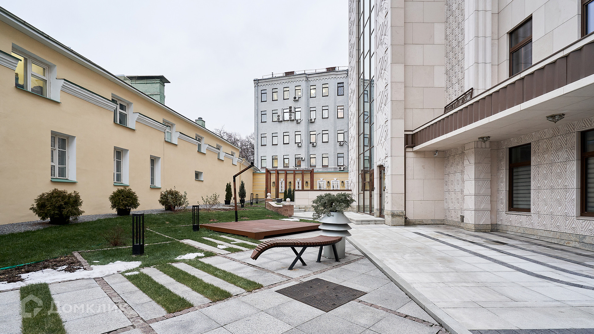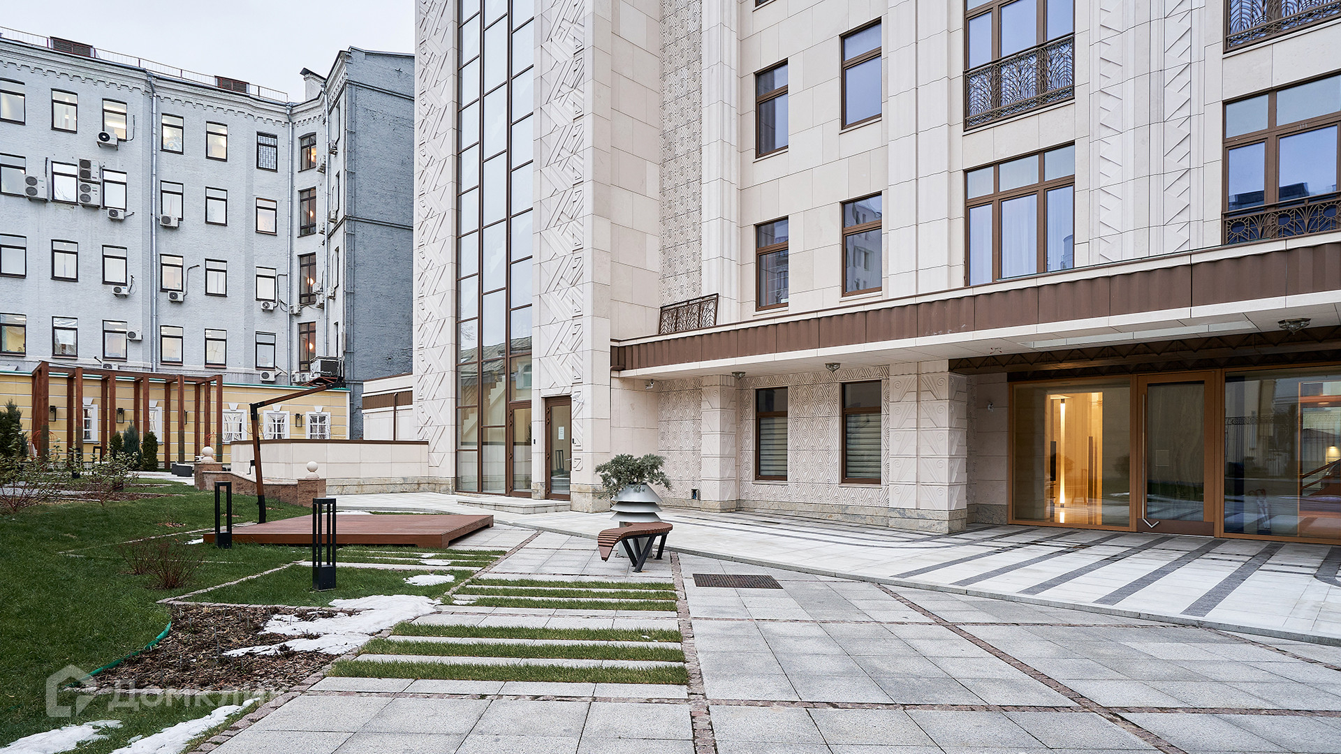 В огороженном внутреннем дворе площадью 400 м² разбили уютный сад с ландшафтным дизайном, организовали места для отдыха. Территория комплекса выложена гранитной плиткой, дизайнерские светодиодные светильники создают особенную атмосферу для прогулок в вечернее время. В доме установили собственную систему очистки воды, а общая система вентиляции работает параллельно с индивидуальным кондиционированием. Жители комплекса могут поручить консьержу заказать химчистку, вызвать такси, забронировать билеты в театр или кино. Двухуровневый подземный паркинг рассчитан на 45 машин.