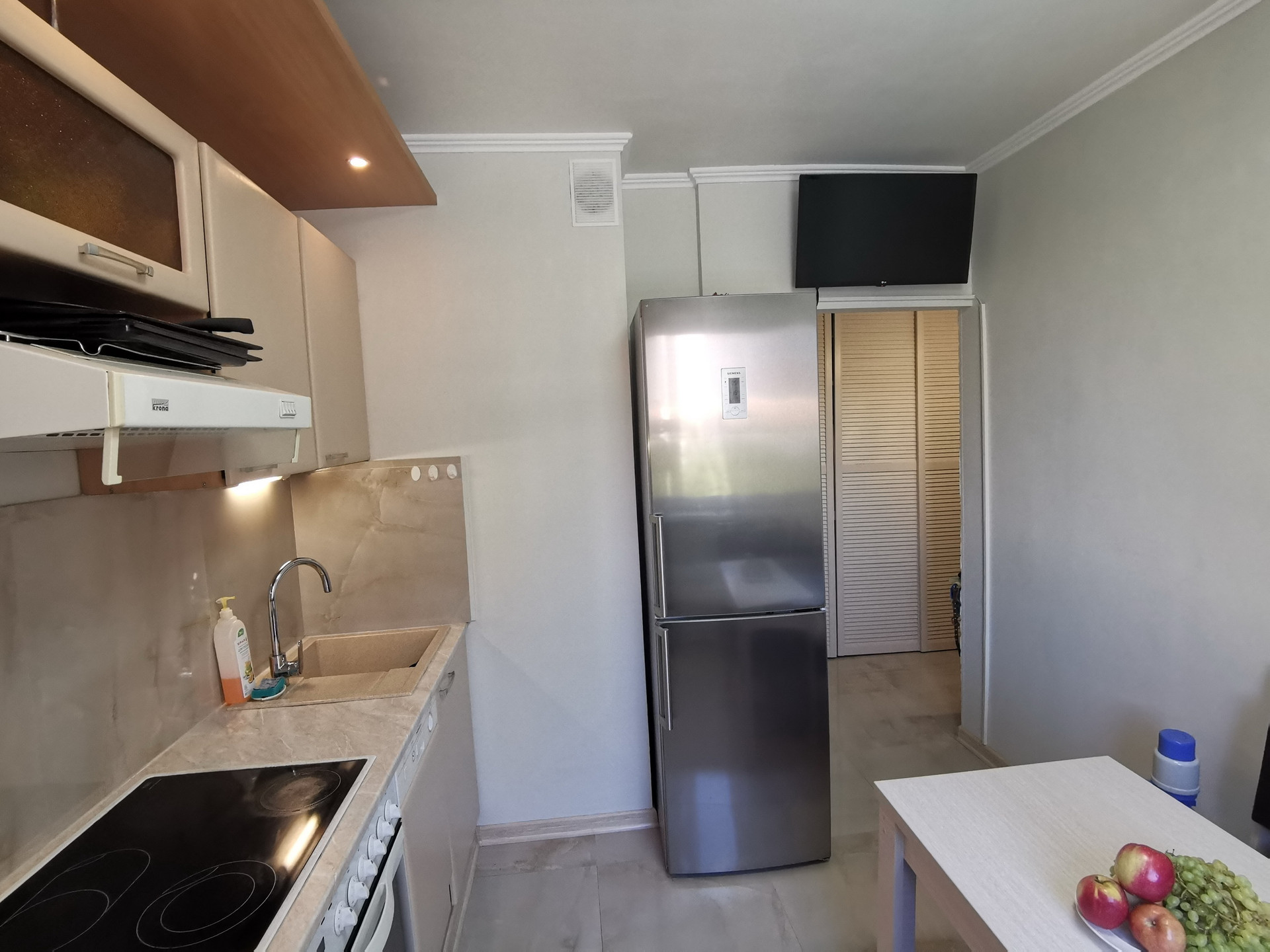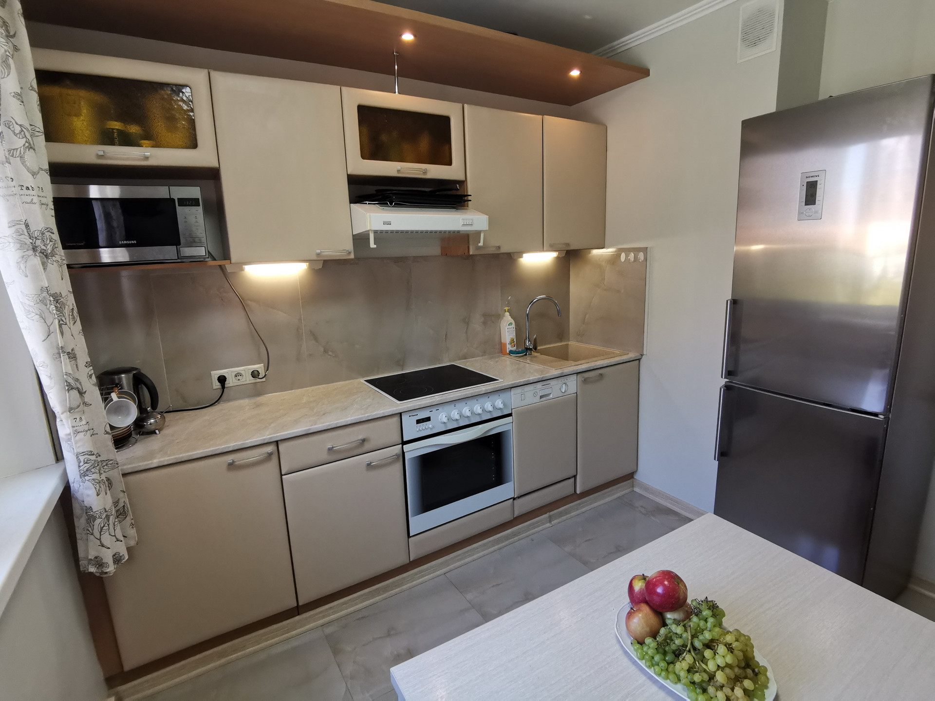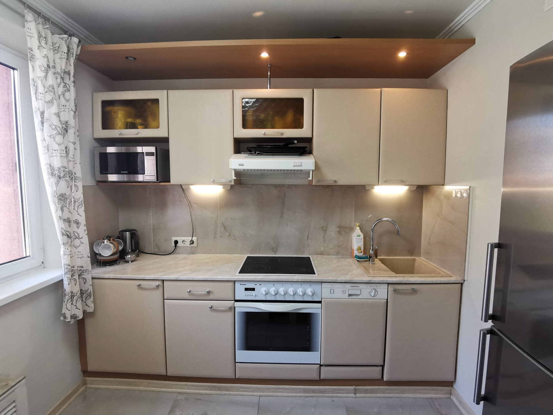 В квартире выполнен капитальный ремонт: замена труб (от стояков) и сантехники, полная замена электропроводки, выравнивание стен, хорошие пластиковые окна с двухкамерными стеклопакетами, полы ламинат и керамогранит. Добротное инженерное оборудование и дорогая сантехника. Встроенная кухня с техникой и холодильником.