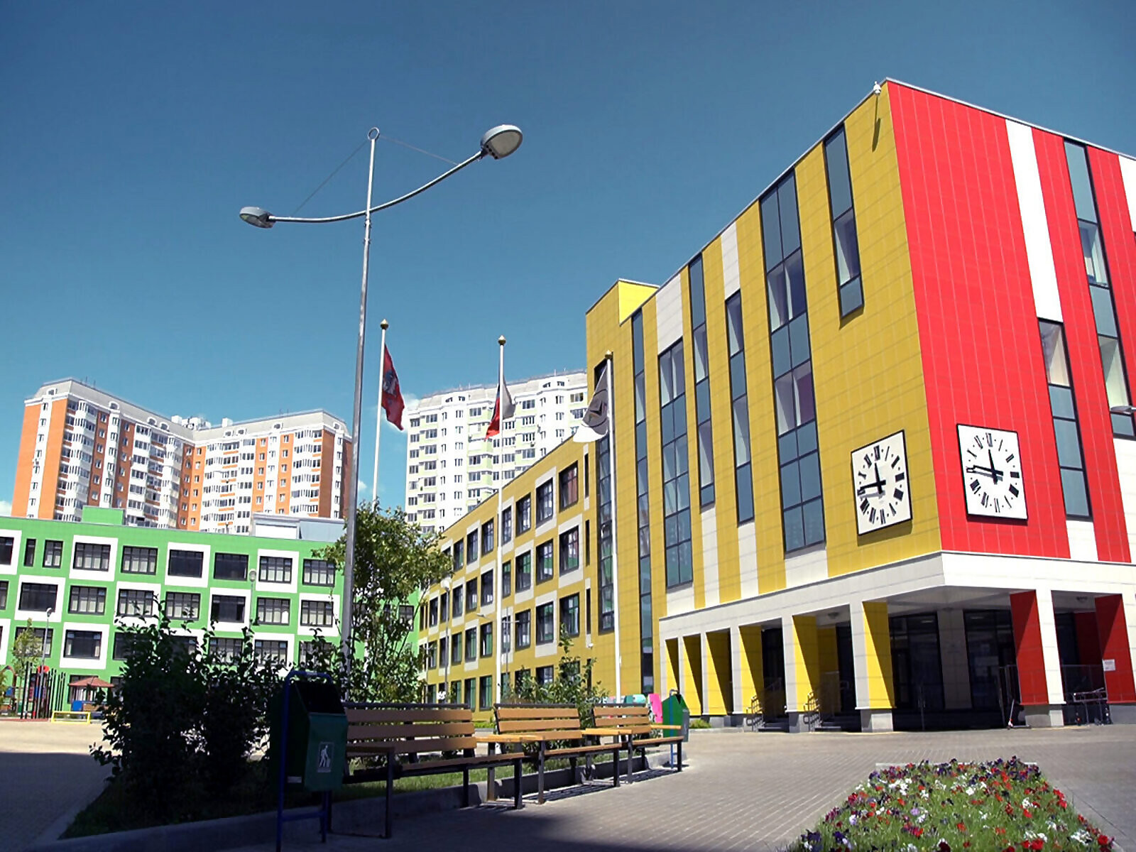 Благоустроенный двор с игровыми площадками и прогулочными зонами.