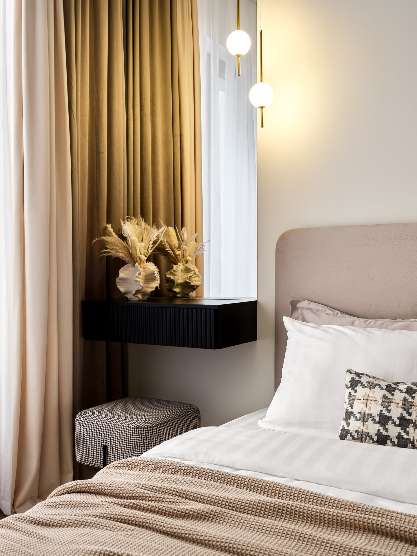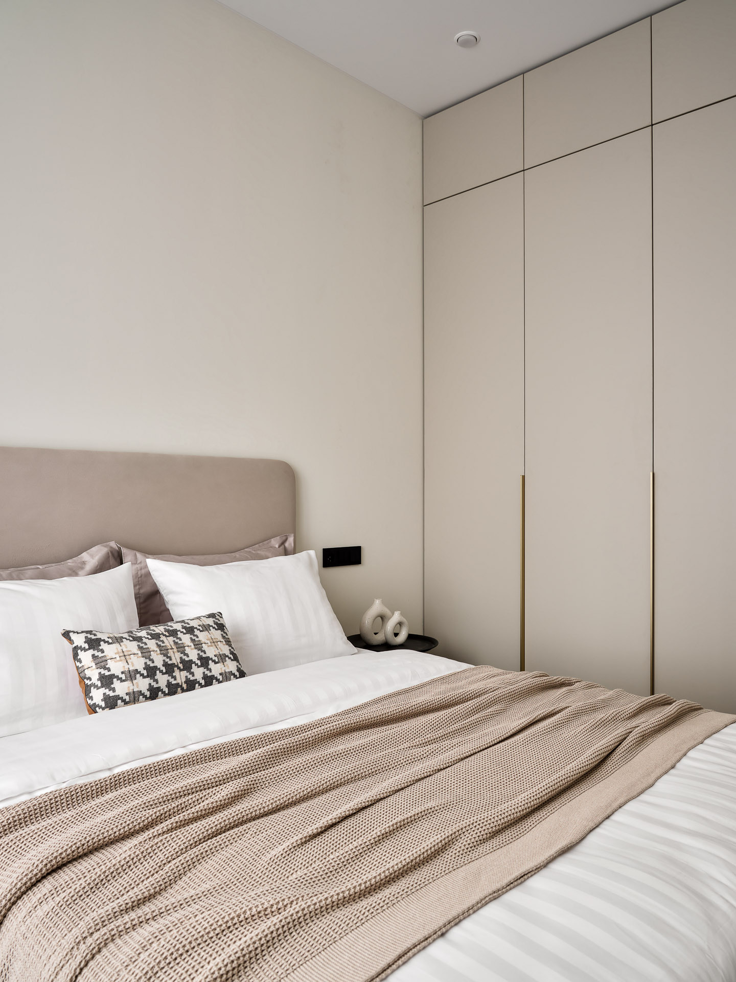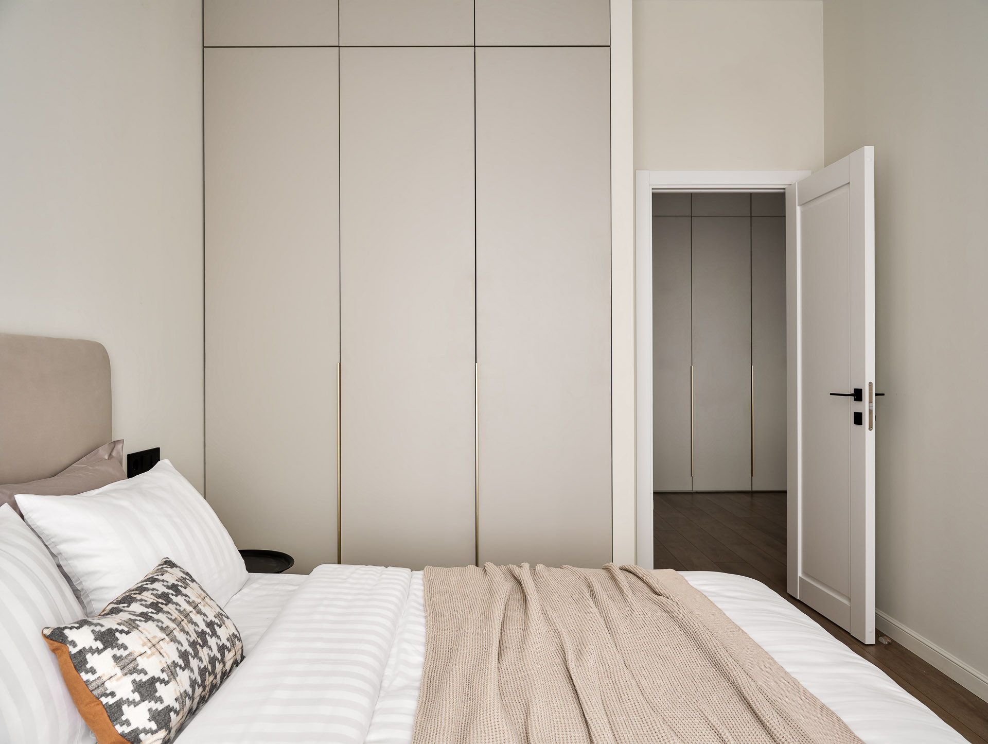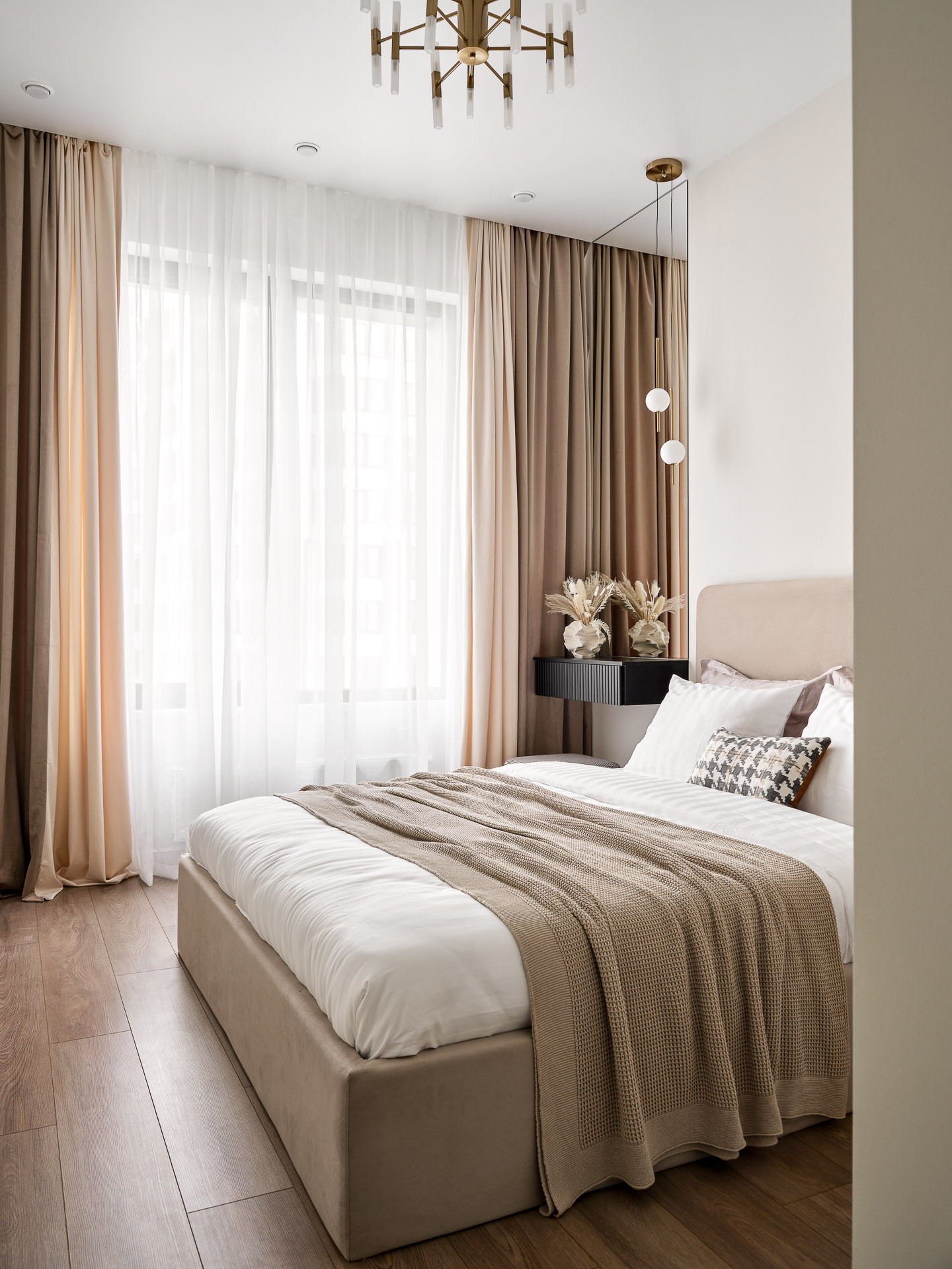 В спальне расположена комфортная двуспальная кровать с мягким изголовьем и подъемным механизмом, вместительный шкаф, а также туалетный столик у окна с дополнительным освещением.