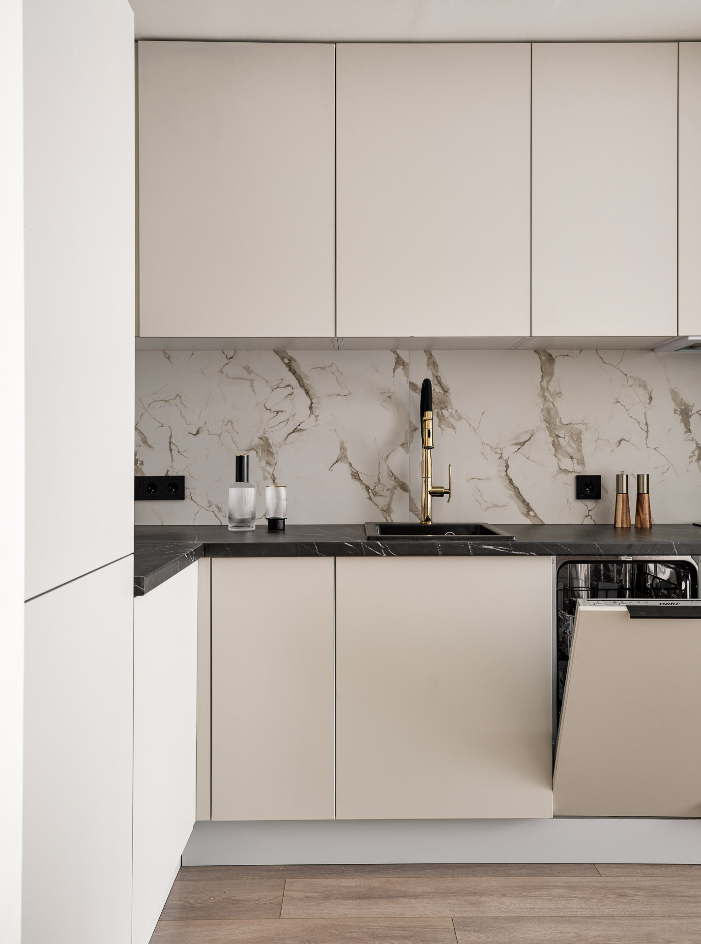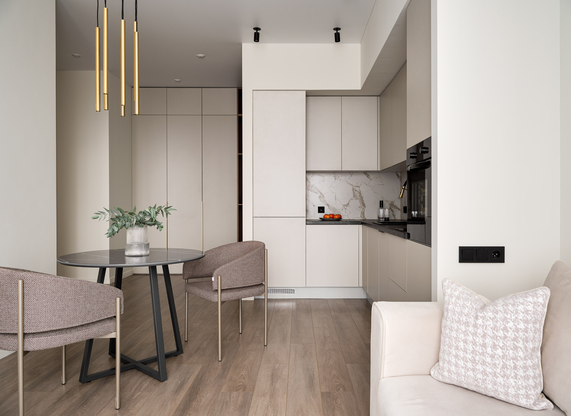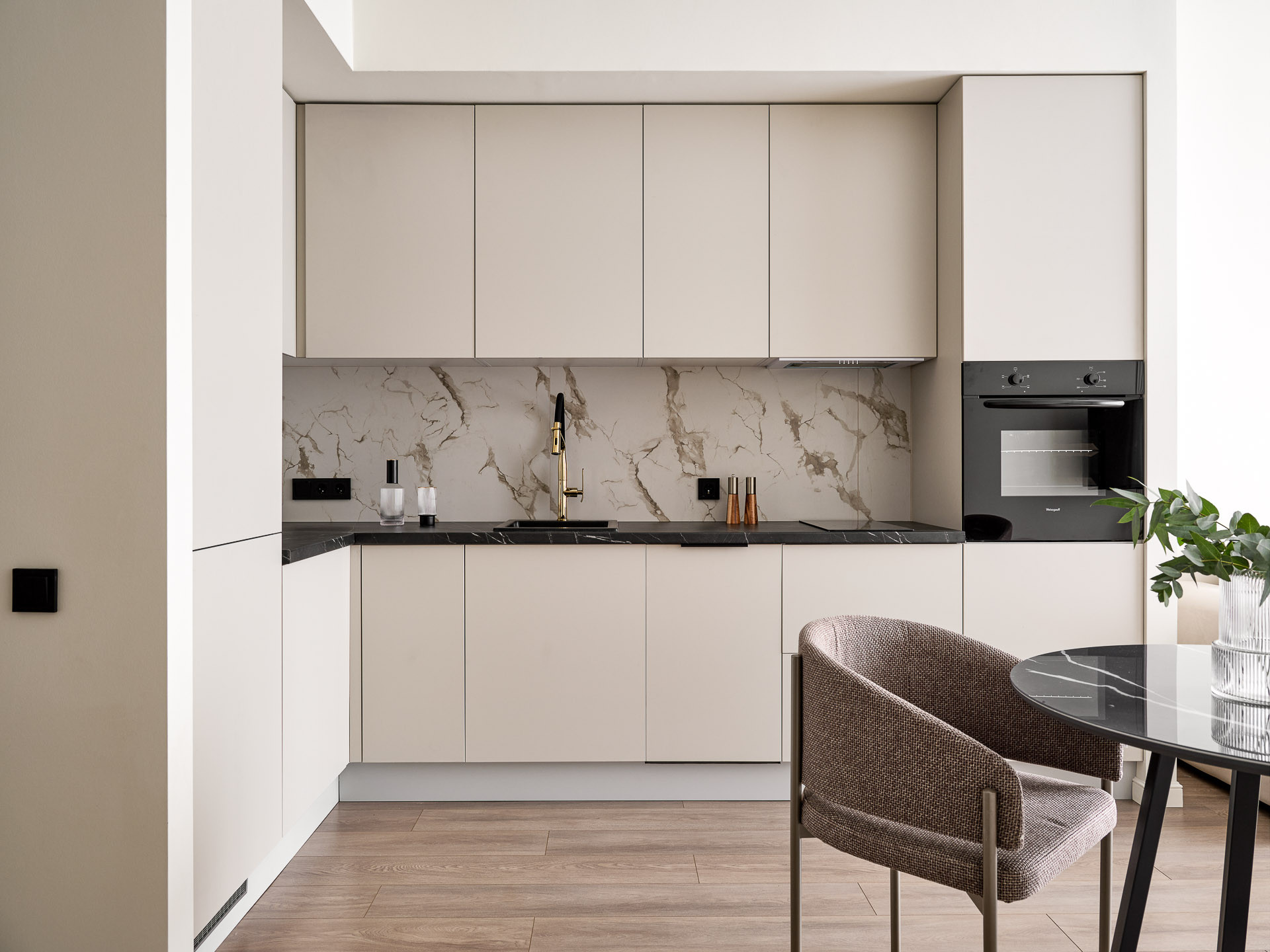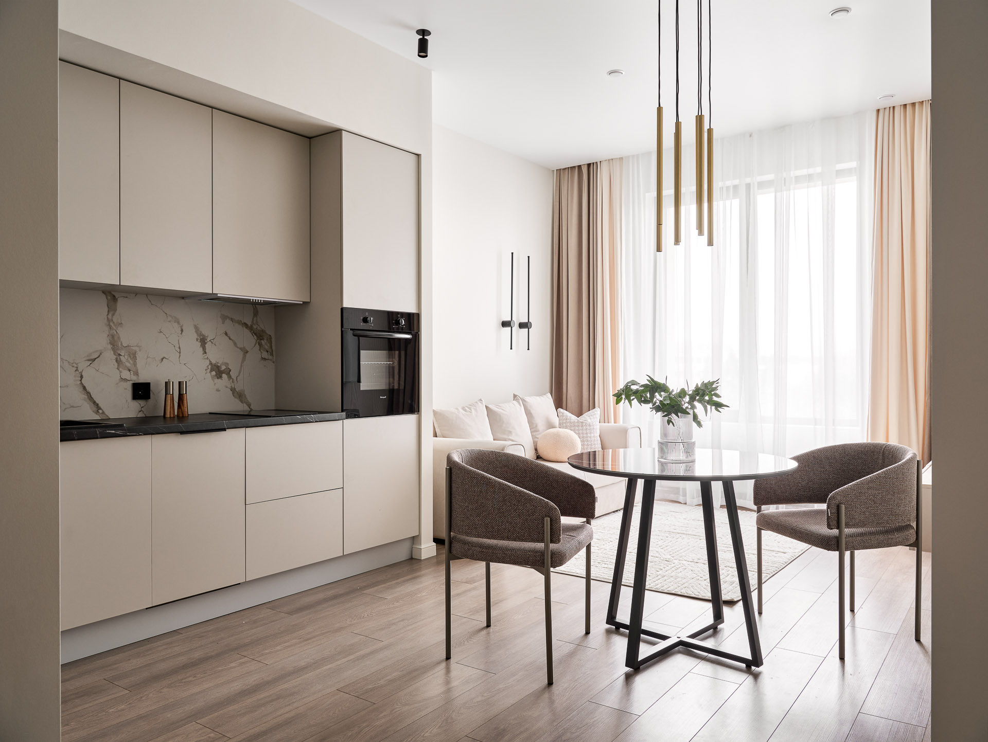 Кухня объединена с просторной гостиной, что создает комфортное единое пространство, идеально подходящее как для приема гостей, так и для организации функционального рабочего уголка или уютной зоны отдыха с шикарным видом. Лаконичная кухня укомплектована холодильником, варочной панелью, духовым шкафом и посудомоечной машиной, а также великолепной обеденной группой с точечным освещением.