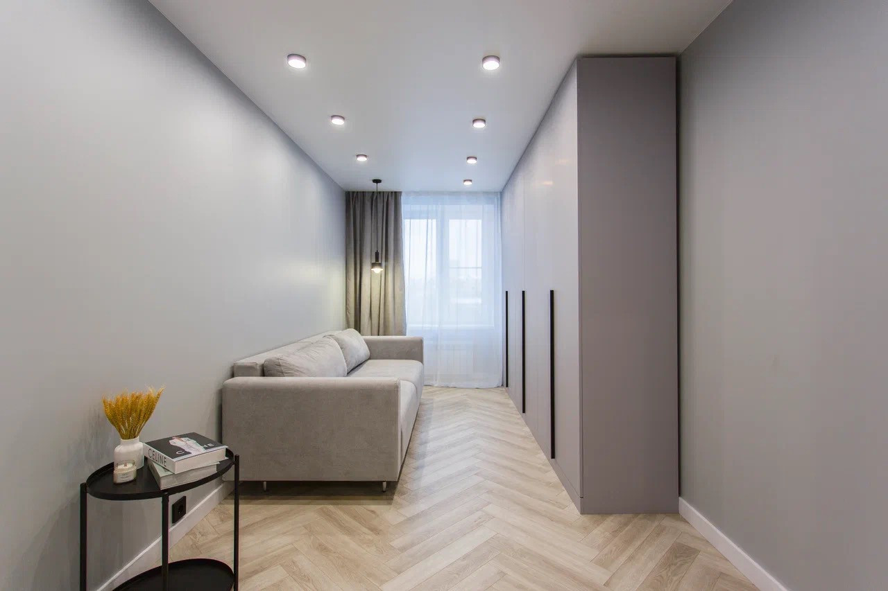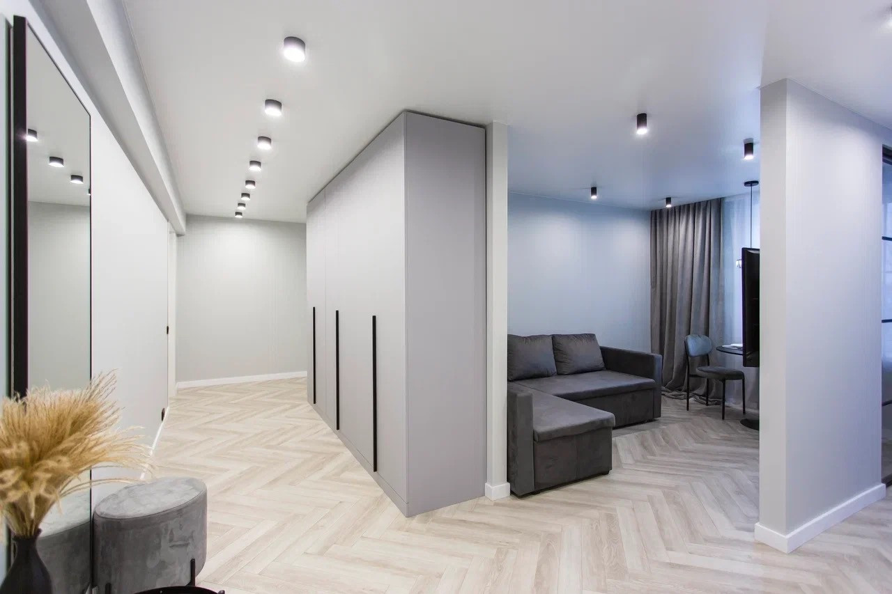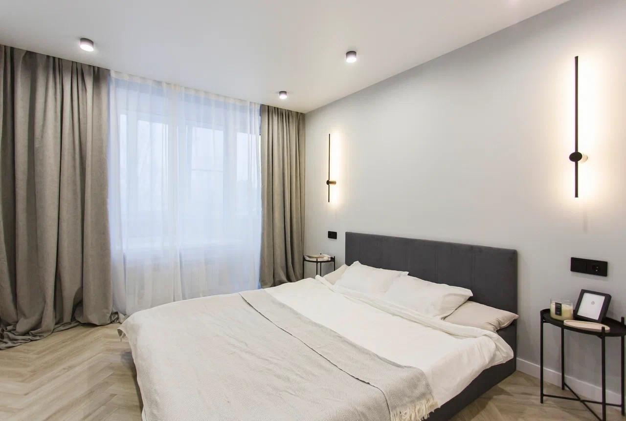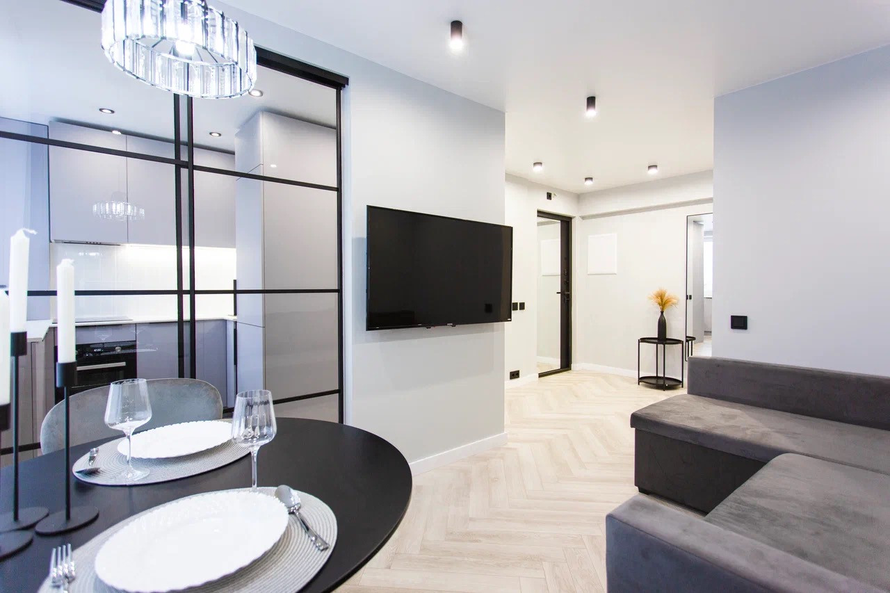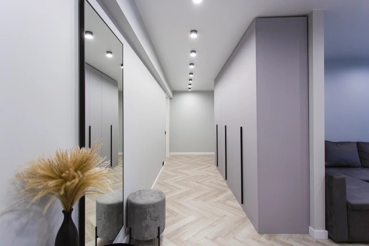Качественный стильный ремонт и дизайн квартиры выполнен в светлых оттенках.