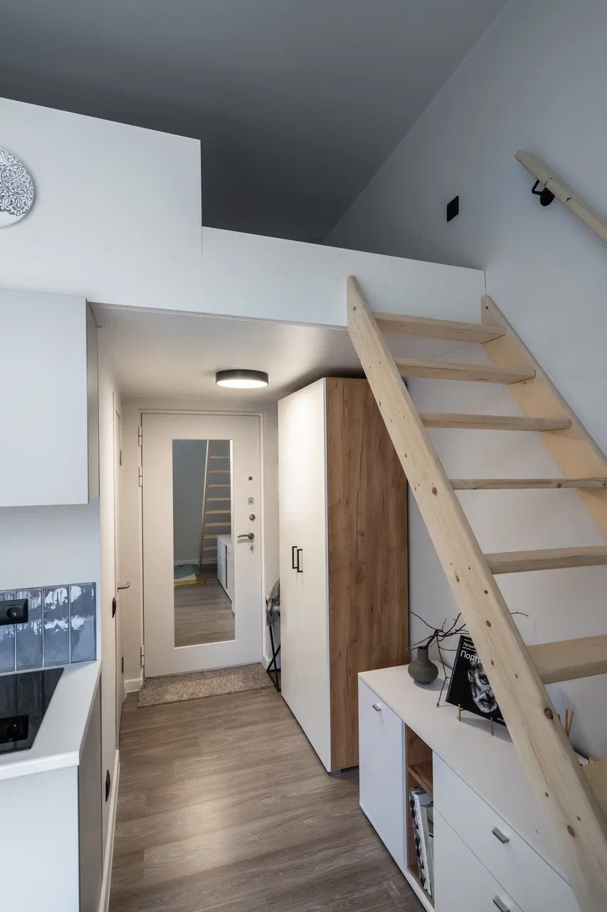 Площадь первого этажа 12,4 кв м, второго антресольного этажа 6,3 кв м.