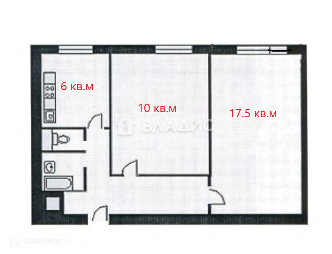 Квартира - 40,3  кв.м. Изолированные комнаты - 17.5+10 кв.м Кухня - 6 кв.м