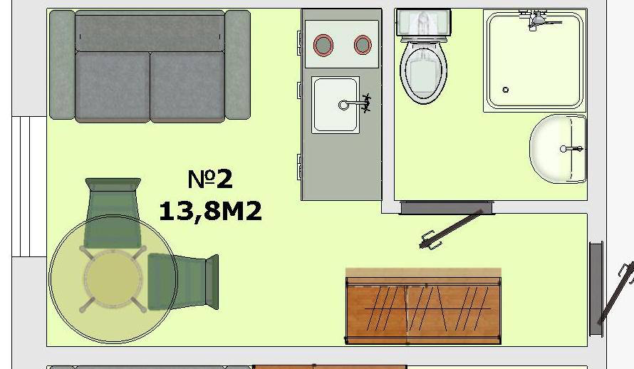 Санузел, зона кухни и отдыха, индивидуальные счетчики на свет и воду,