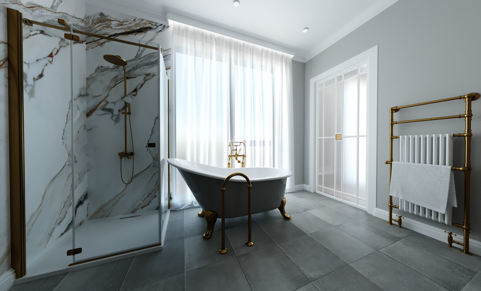 Квартира комфортной площади, с высокими потолками и окнами в пол.