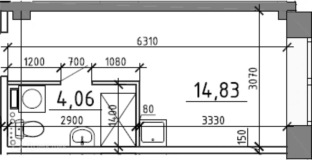 Помещение с подчистовой отделкой и высотой потолков от 3,3 метров. В апартаментах одно или два больших окна, в зависимости от площади.