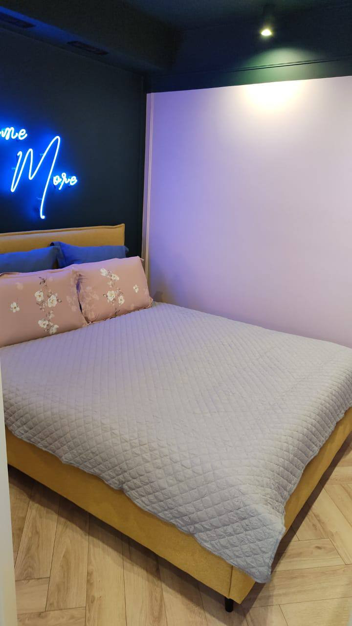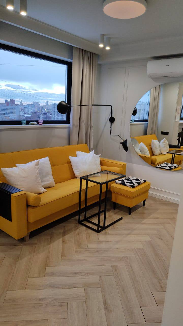 Комната разделена на 2 зоны: спальная + гостиная, кухня 10м2, совмещенный санузел, балкона нет. Дизайнерский ремонт. 2 больших и 2 маленьких лифта. Это здание гостиницы Металлург. Квартира находится на 15 этаже. Развитая инфраструктура.