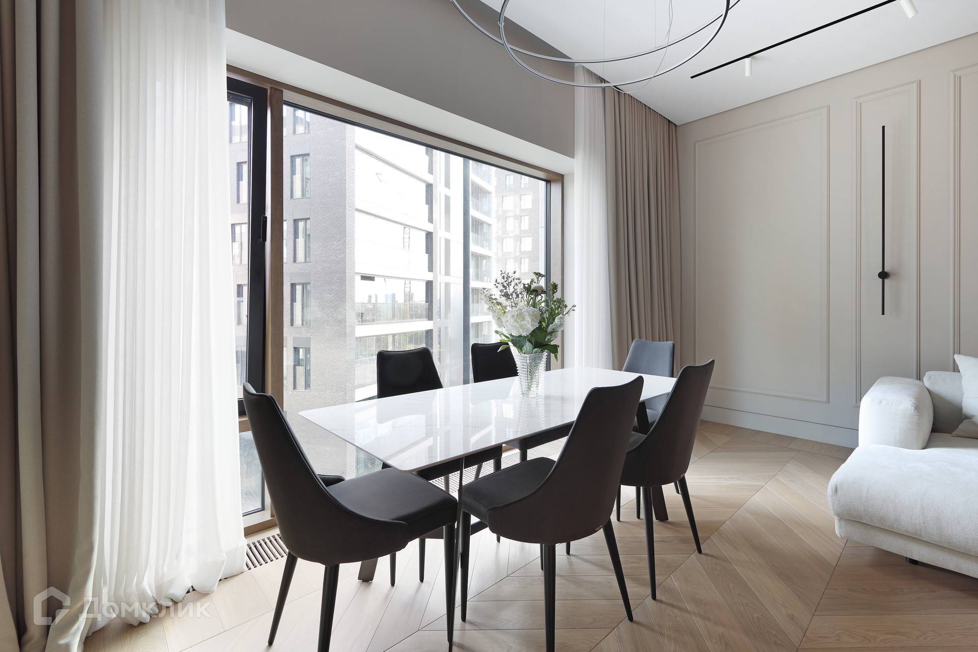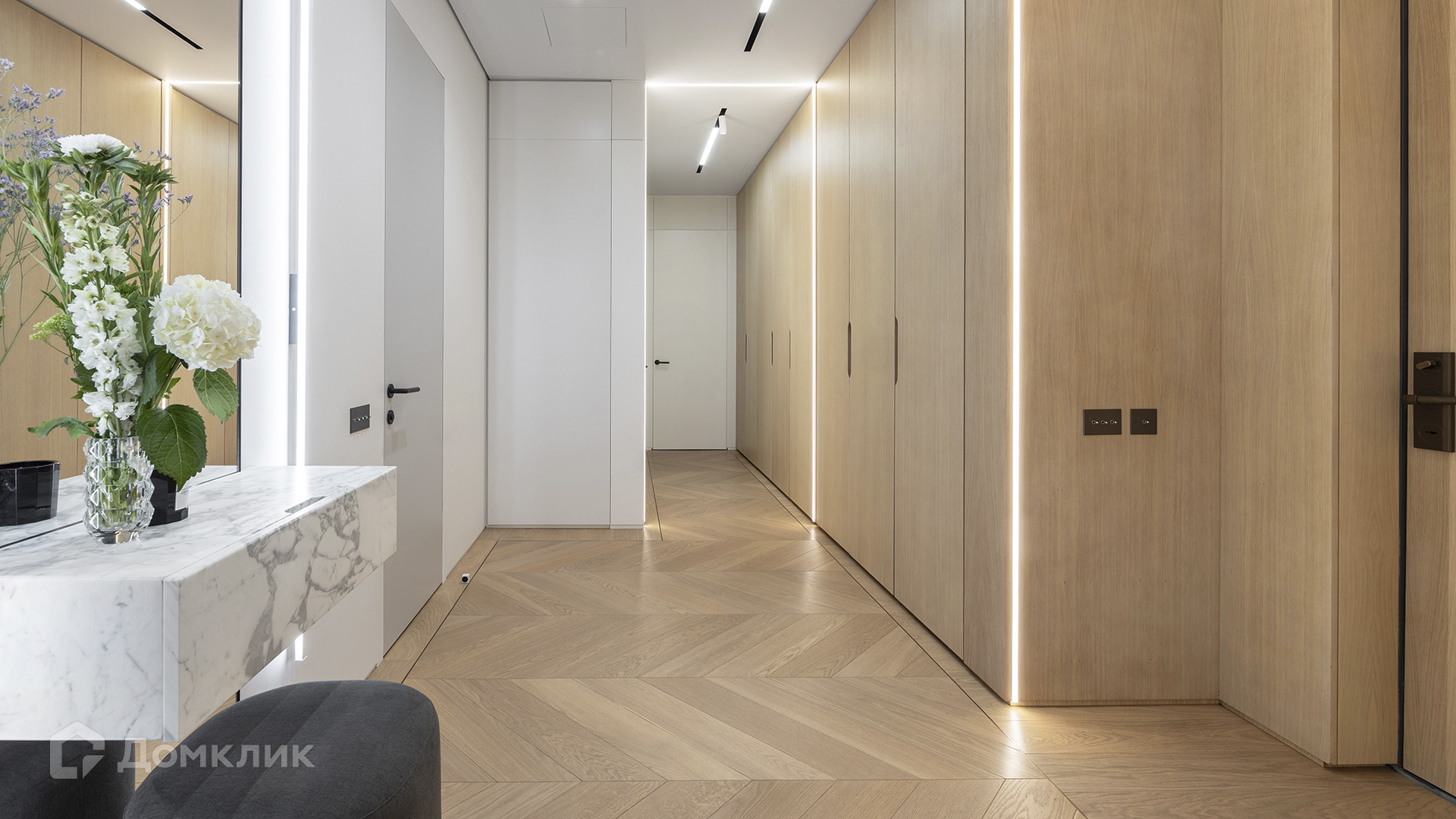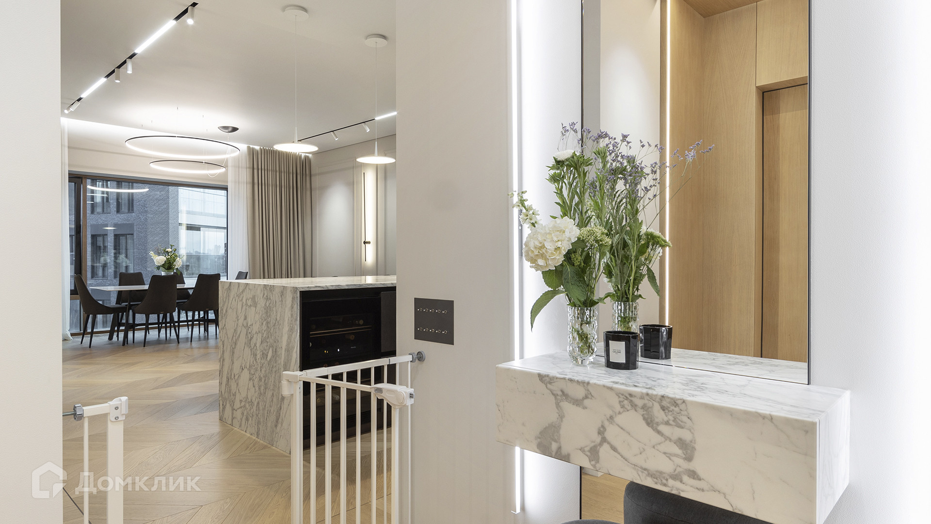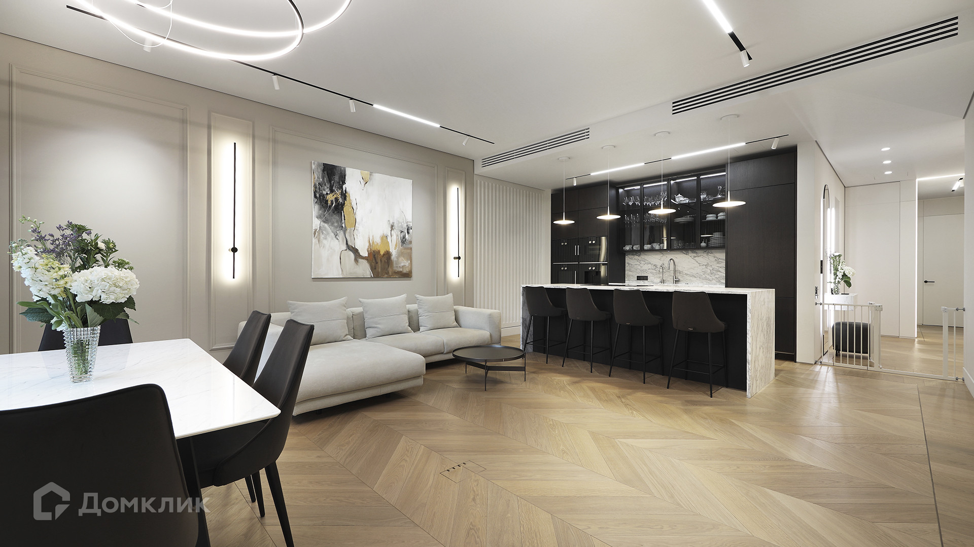 ID 225 070. Дизайнерская квартира с 2-мя спальнями комплексе премиум-класса «Вишневый сад». Выполнена премиальная отделка в стиле современной классики, не от застройщика. Натуральный мрамор из Италии, Испании и Греции — Calacatta, Nero Marquina, Polaris. Инженерная доска из дуба Bonum. Панорамное остекление, виды на внутренний двор и «Москва-Сити». Высота потолков 3,5 метра.