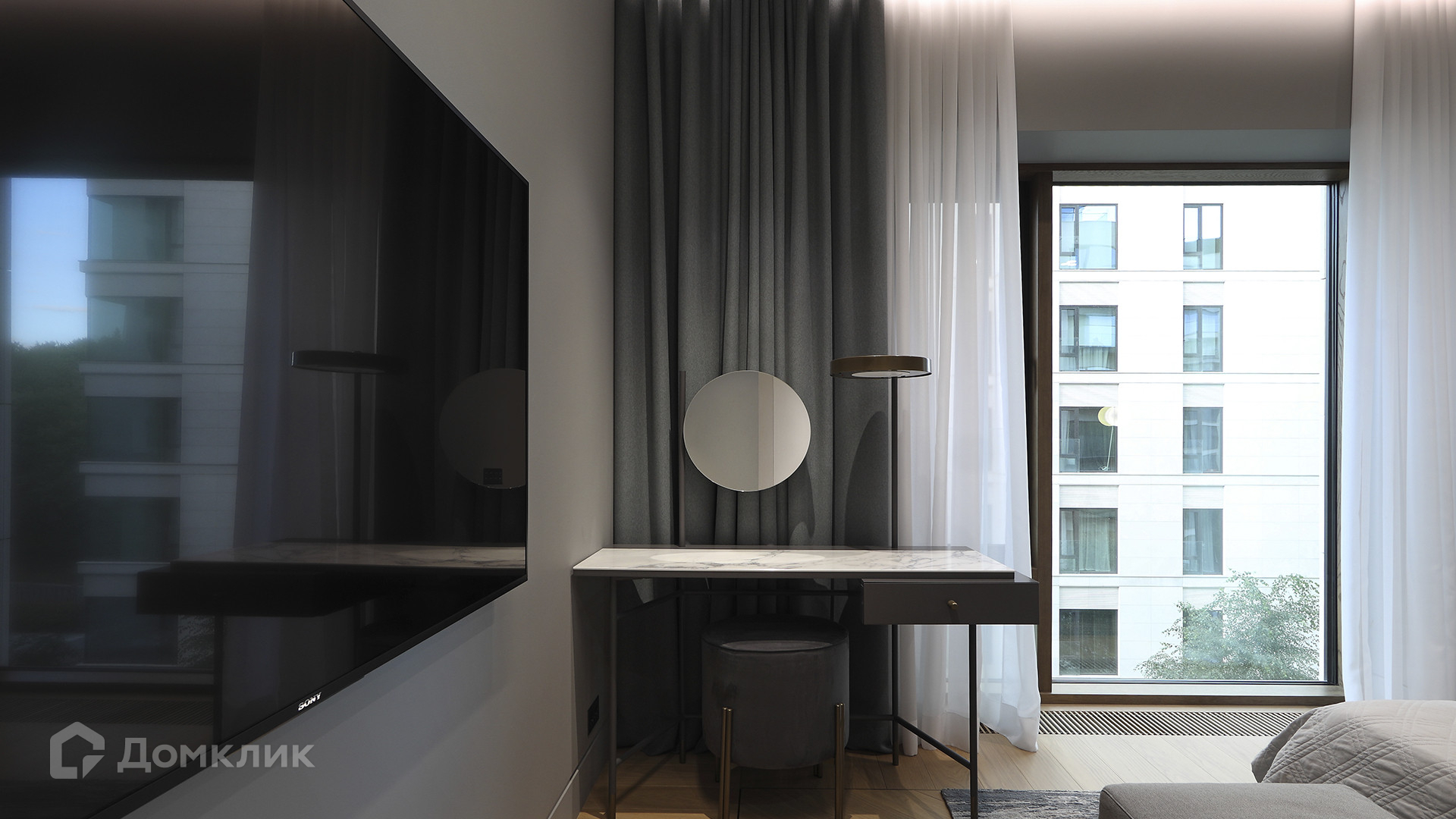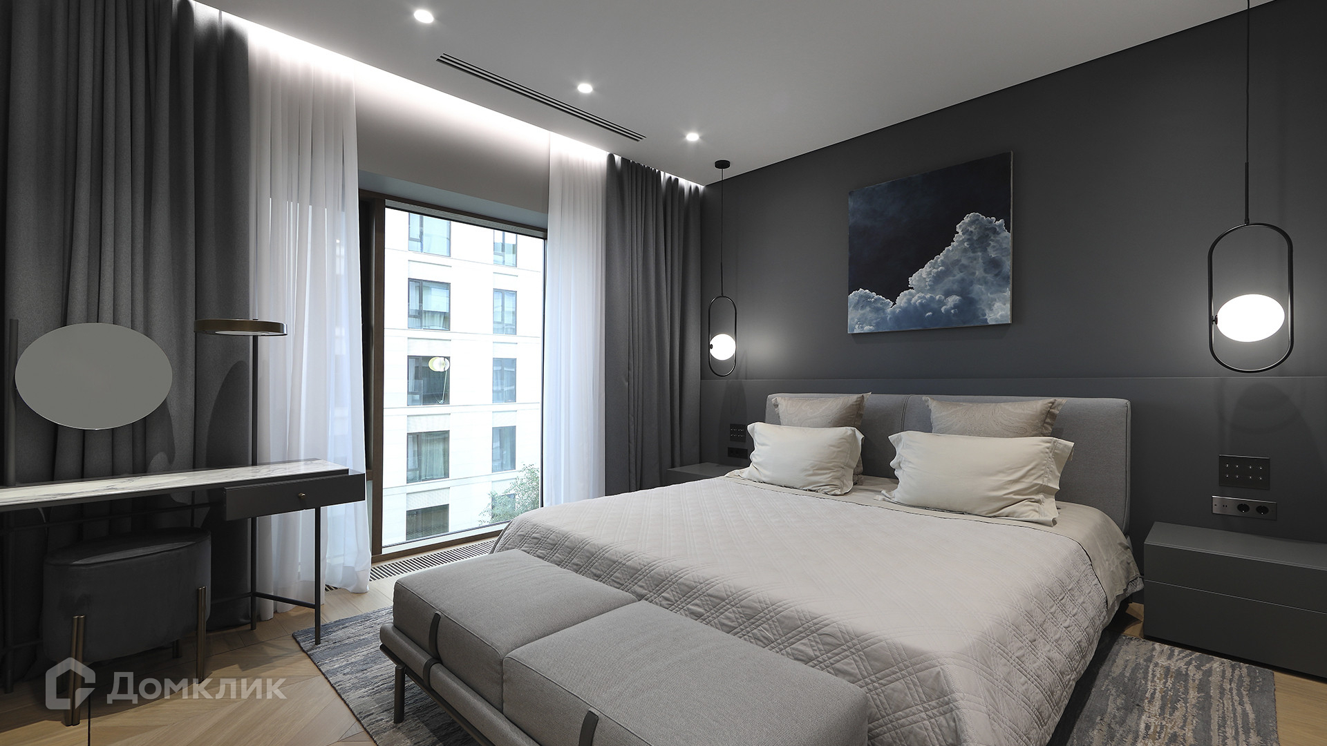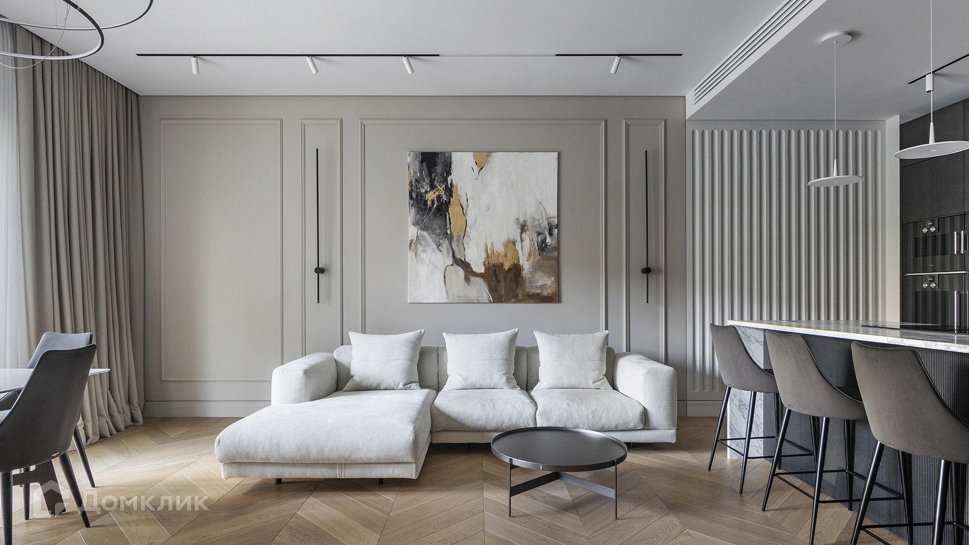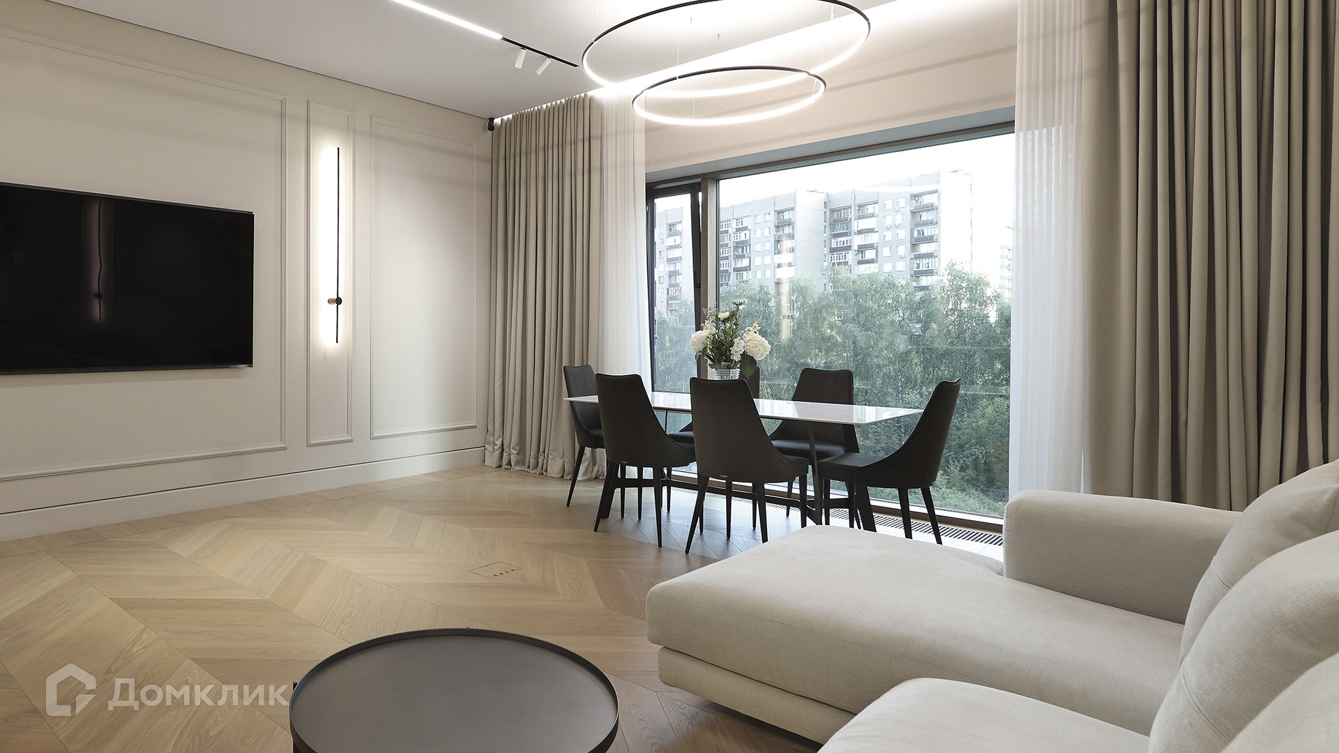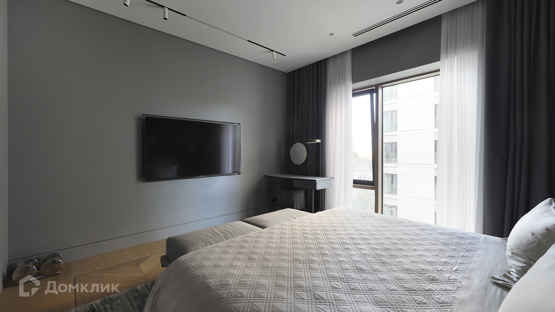 ID 225 070. Дизайнерская квартира с 2-мя спальнями комплексе премиум-класса «Вишневый сад». Выполнена премиальная отделка в стиле современной классики, не от застройщика. Натуральный мрамор из Италии, Испании и Греции — Calacatta, Nero Marquina, Polaris. Инженерная доска из дуба Bonum. Панорамное остекление, виды на внутренний двор и «Москва-Сити». Высота потолков 3,5 метра.
