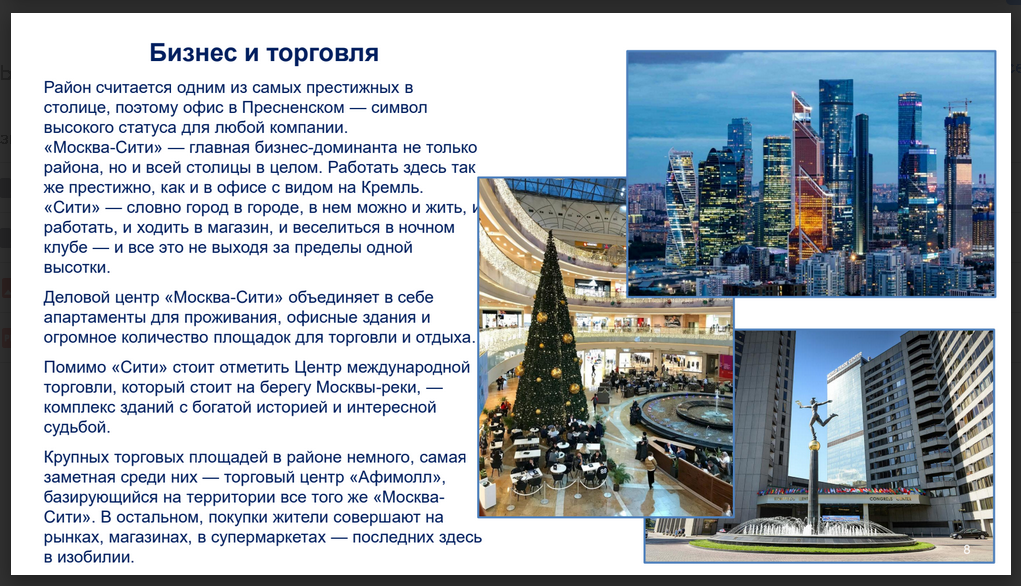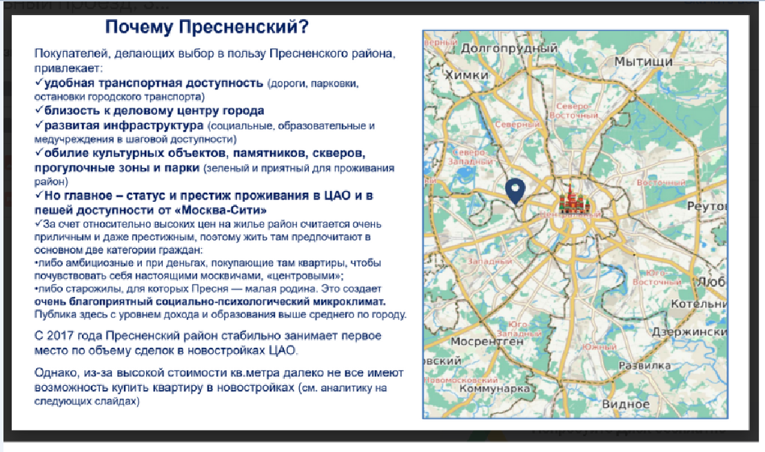 Это идеальное место для тех, кто ценит комфорт, элегантность и престиж. Пресненский район считается одним из лучших в Москве. Статусный и престижный, а потому жилье в нем стоит на порядок выше, чем в среднем по городу.