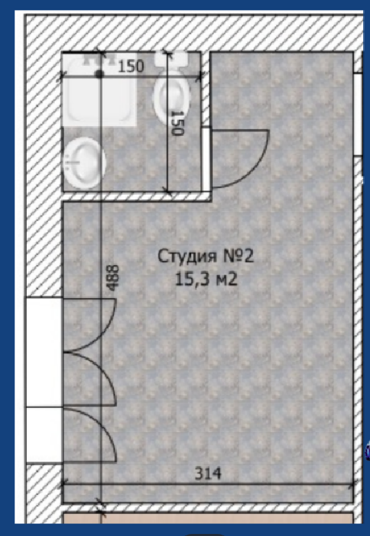 Студия под чистовой ремонт. В стоимость студии входит установка новой входной двери, разведение всех коммуникаций до точки, установка счетчиков на свет, горячую и холодную воду и качественный ремонт под «ключ» в общем коридоре.