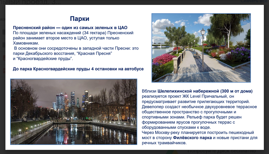 Через Москва-реку будет построен пешеходный мост в сторону Филёвского Парка и новые пристани для речных трамвайчиков. Набережная уже максимально обустроена. А в скором времени превратится в единую прогулочную зону – вплоть до Москва-Сити. Статусный и престижный Пресненский район.
