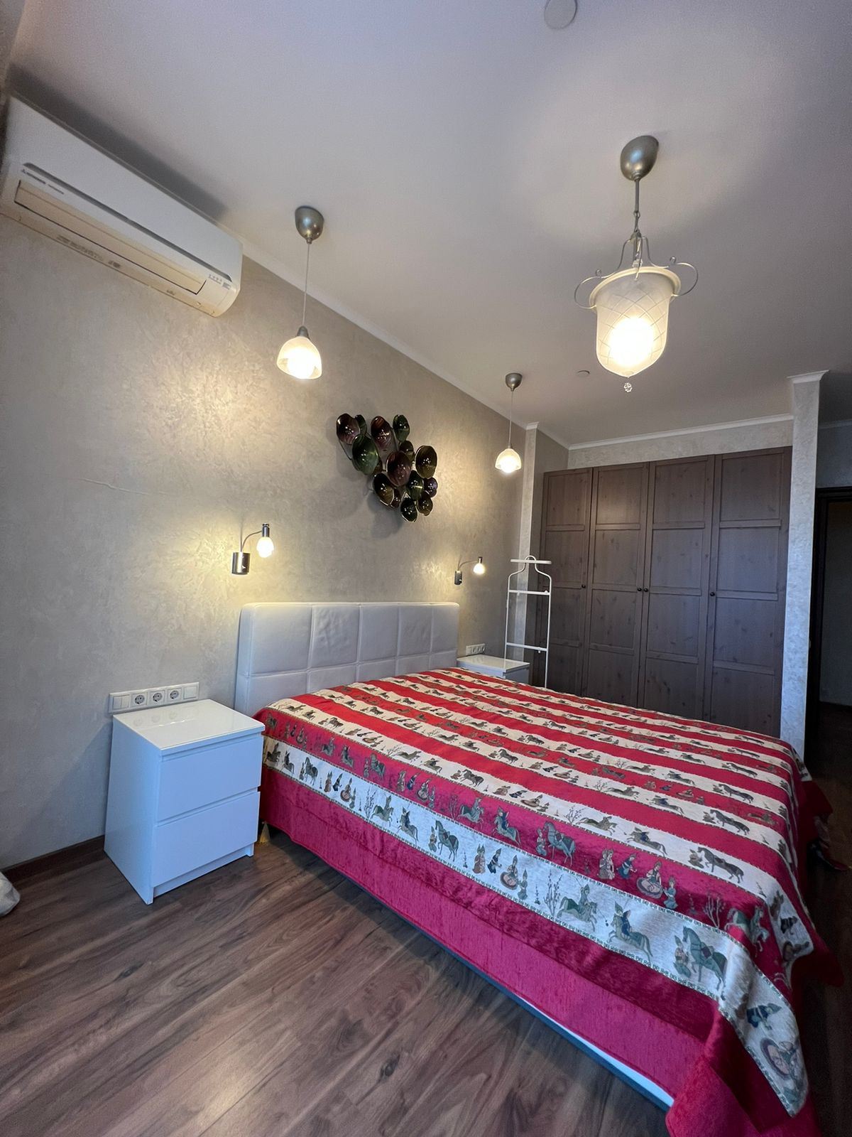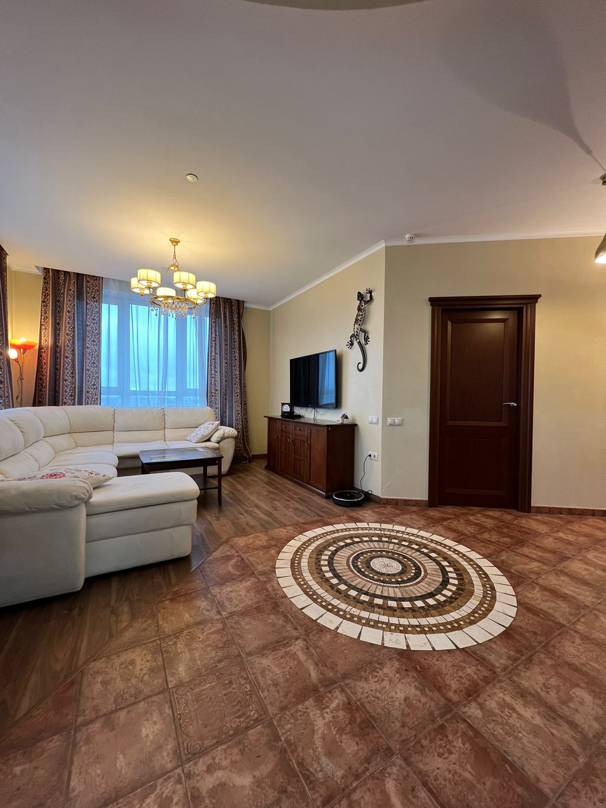 Все двери в квартире (в том числе входная) изготовлены на заказ у известной итальянской фирмы Baraus. В квартире во время ремонта использовались: плитка –Испания, отделка стен - итальянская штукатурка фирмы San Marko, на полу в гостиной каменное панно ручной работы (травертин, мрамор, натуральные камни), ламинат 33 класс фирмы Pergo Швеция, в спальне и в большой комнате установлена сплит система -мульти сплит Mitsubishi.