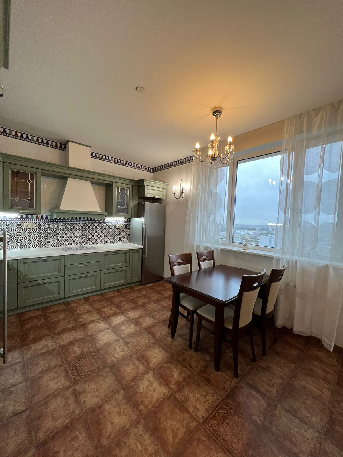 Кухня (15 кв.м.) с встроенным итальянским кухонным гарнитуром и современной бытовой техникой. На полу испанская плитка и теплый пол.