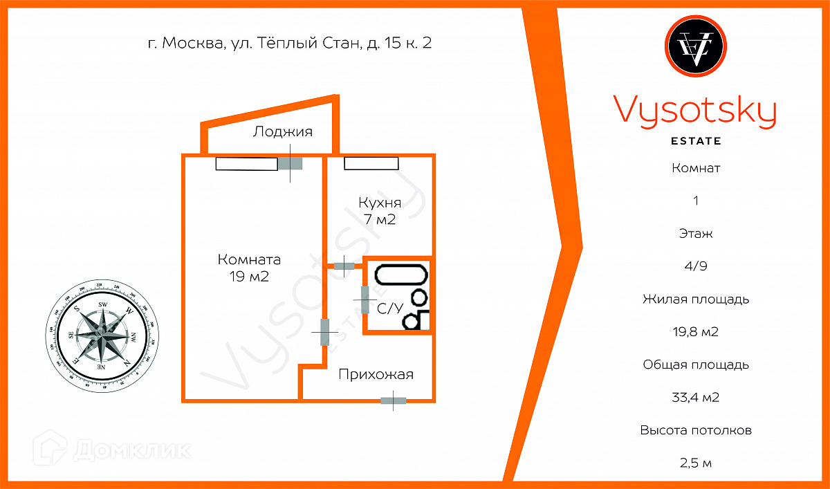 1-комнатная квартира, 33.4 м2, этаж 4 / 9, на продажу в Москве, улица Тёплый Стан, 15к2