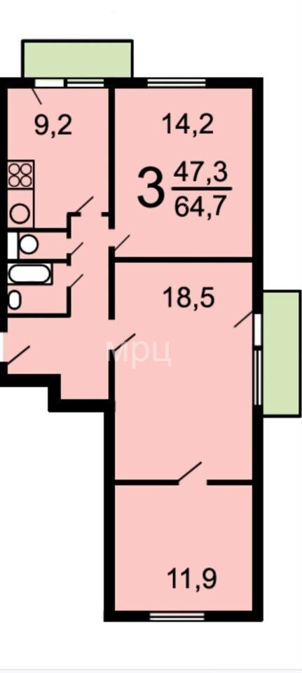 Жилая площадь 47.3 м2
