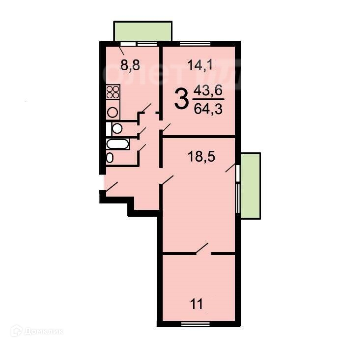 Общая площадь 64.3 м2