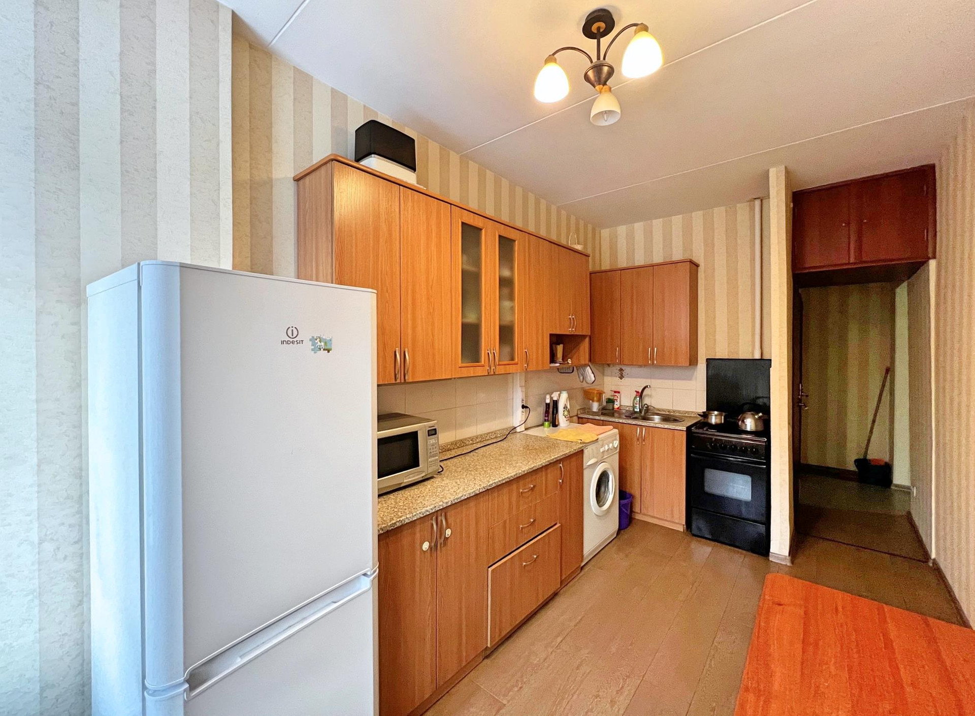 На полу в комнатах ламинат, на кухне и в коридорах- керамогранит, встроенная кухня с холодильником, стиральной машиной. Есть мебель, по договоренности все можно оставить.