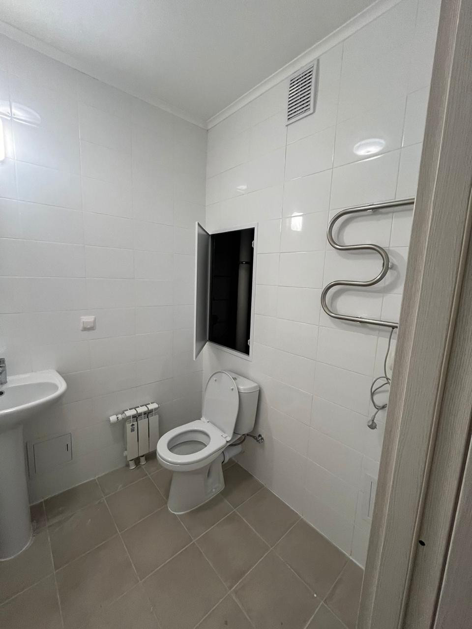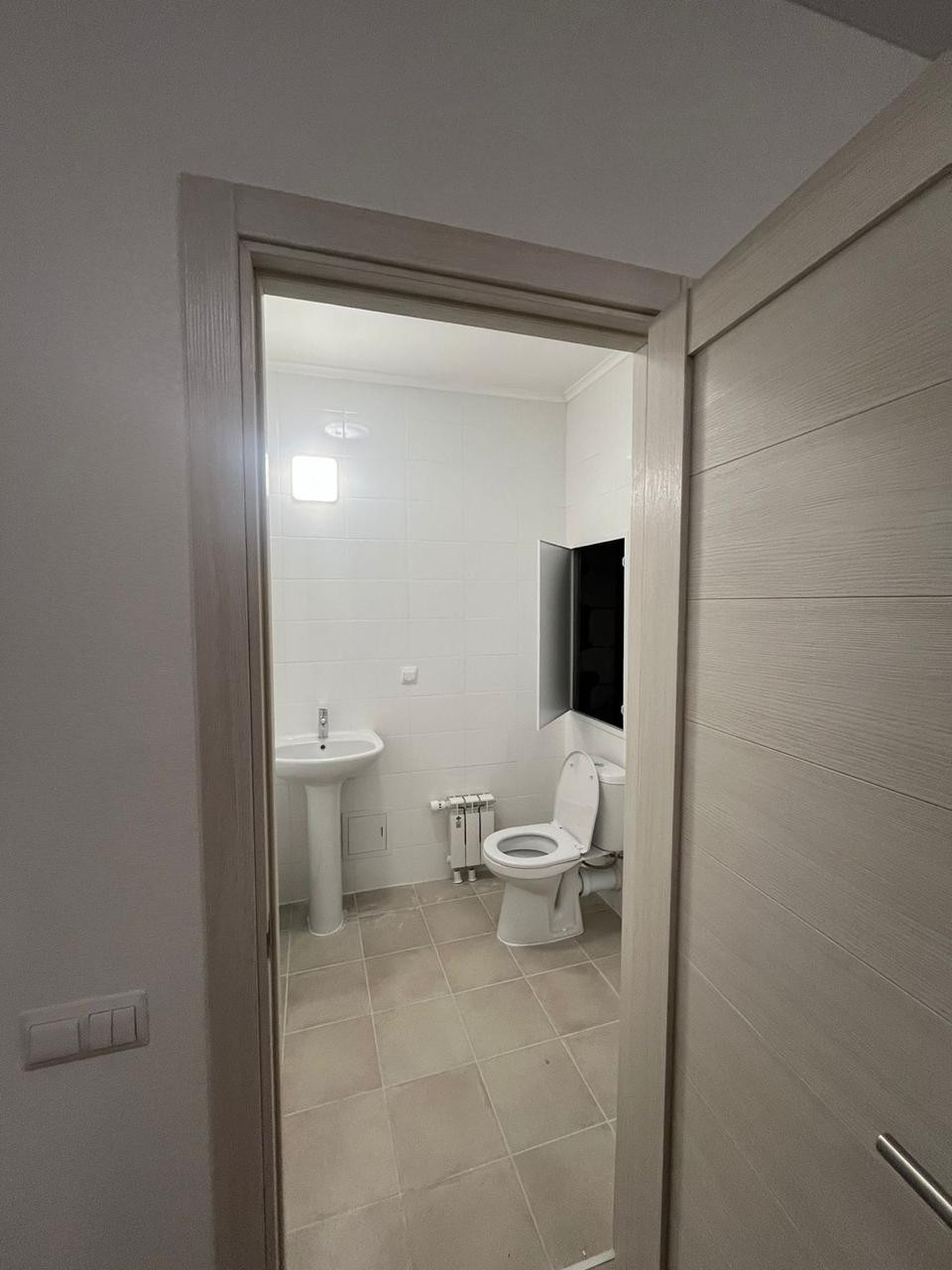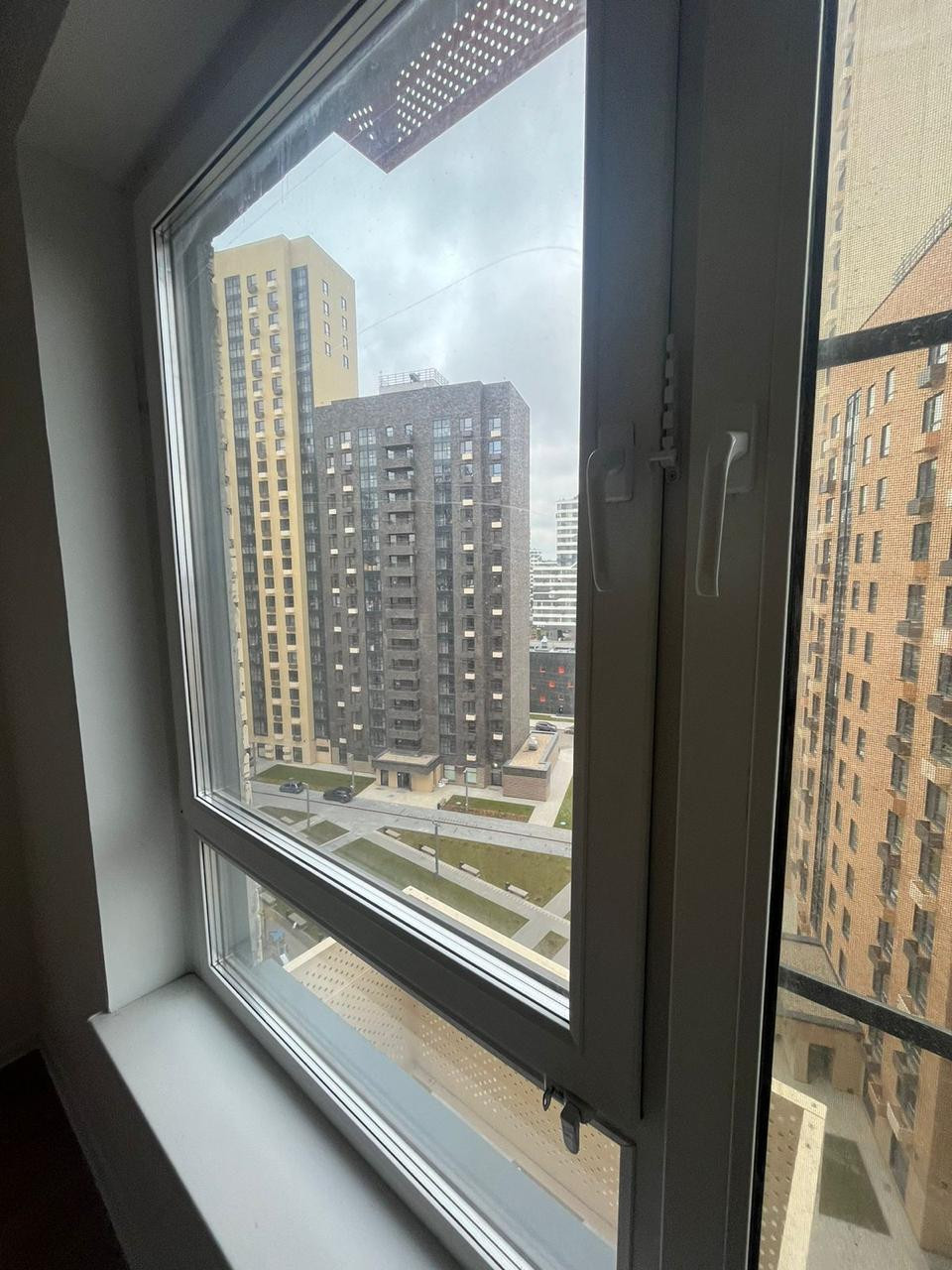 Планировка квартиры удобная и практичная: окна выходят на разные стороны дома, во двор и на школу, большая кухня, холл и коридор, 2 санузла (один с ванной, раковиной, батареей). Снаружи имеются корзины для установки кондиционеров. Вид из окна с перспективой на город.