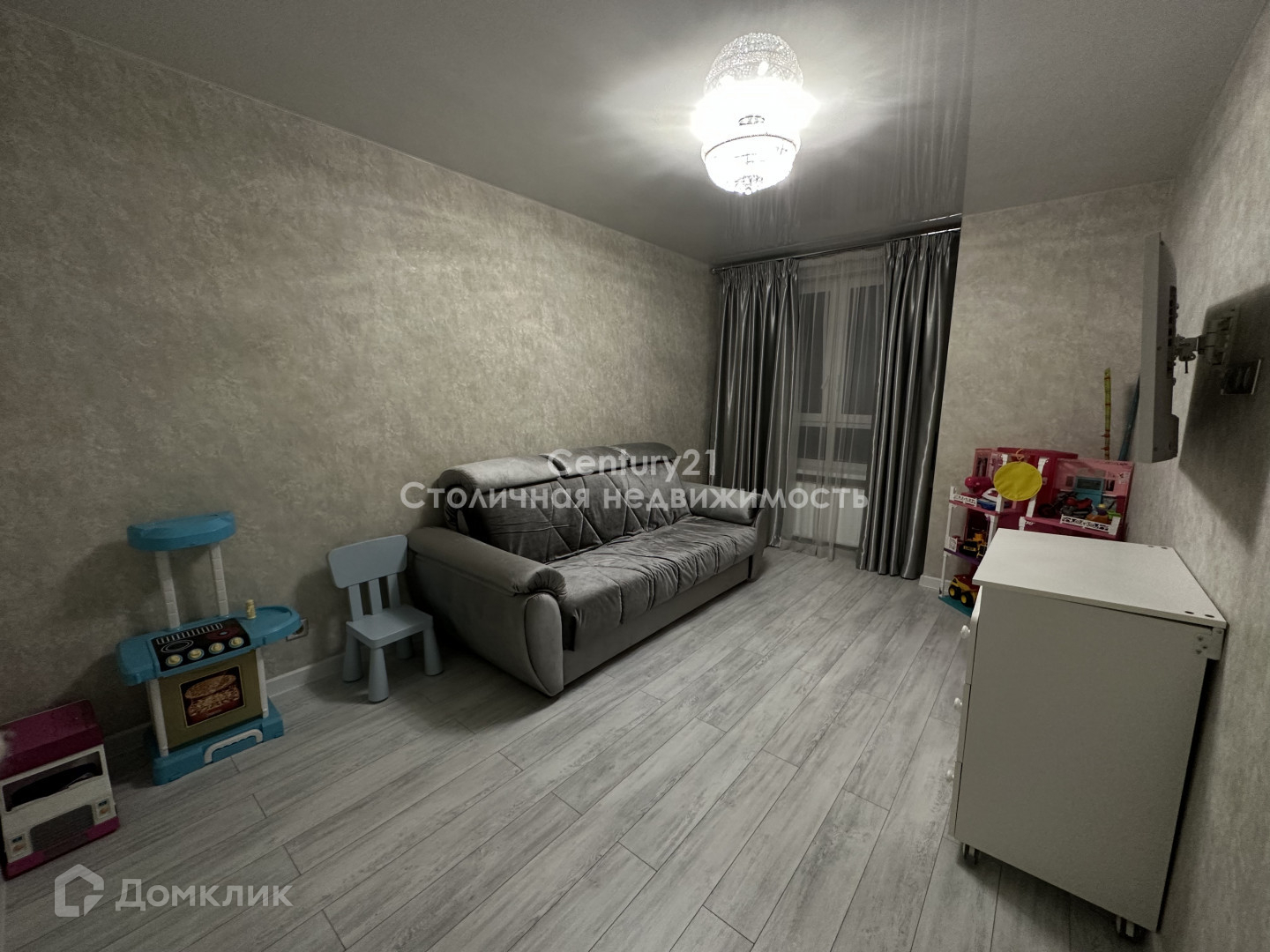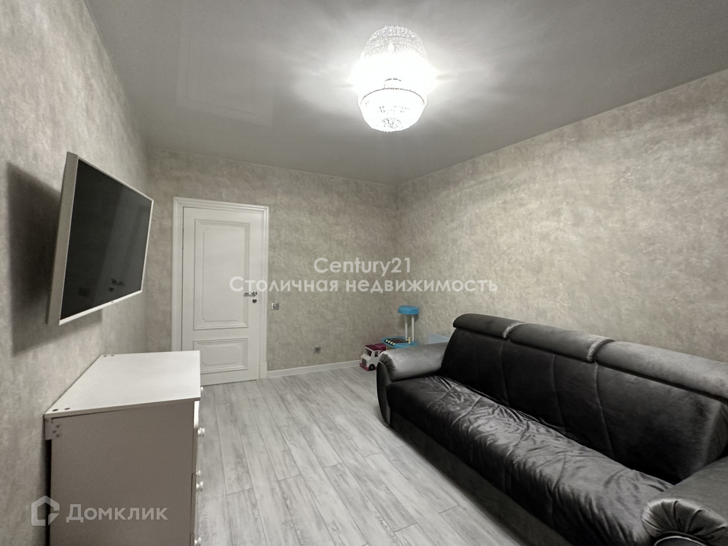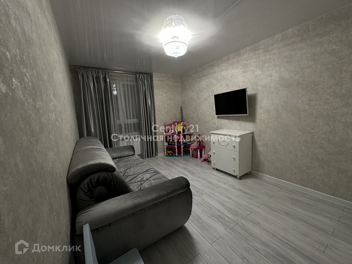 Вторая комната также готова для полноценного использования, есть диван, комод и телевизор.