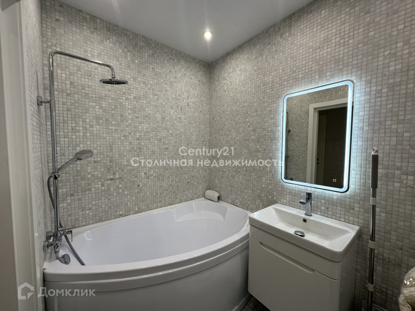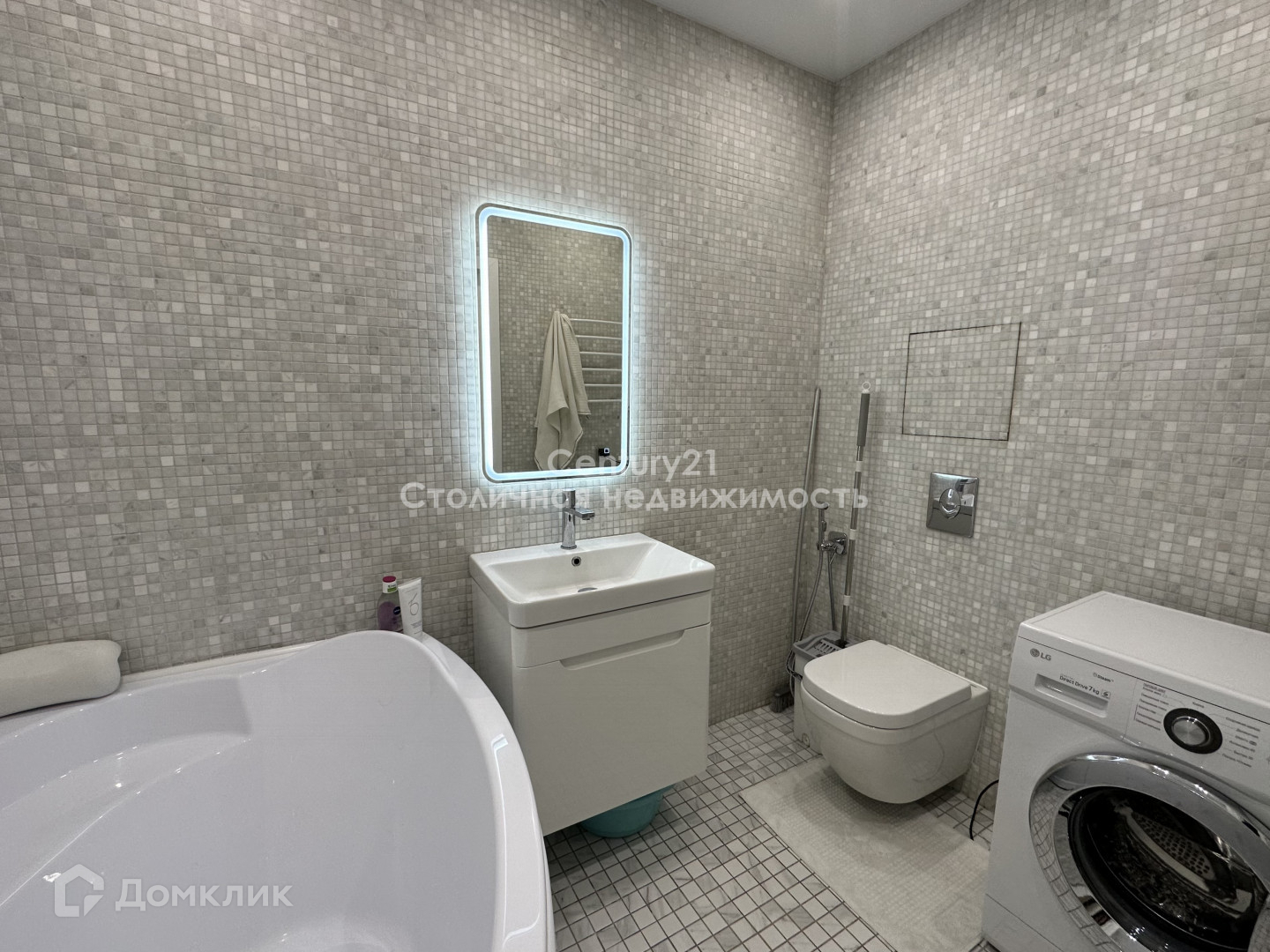 Санузел оборудован большой ванной, зеркалом с подсветкой и стиральной машиной.