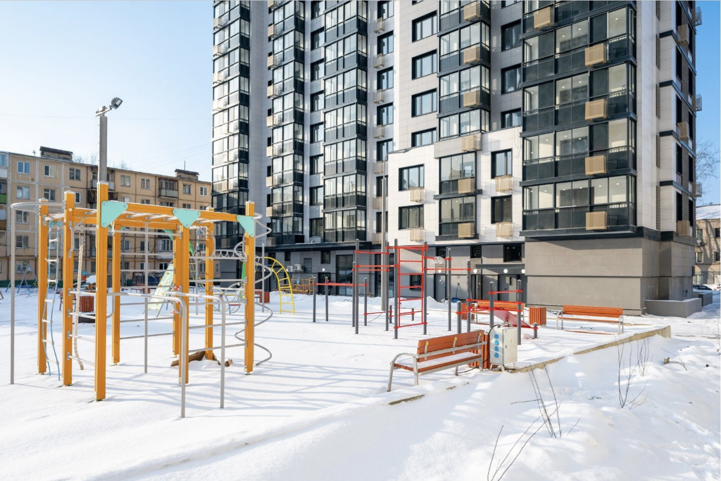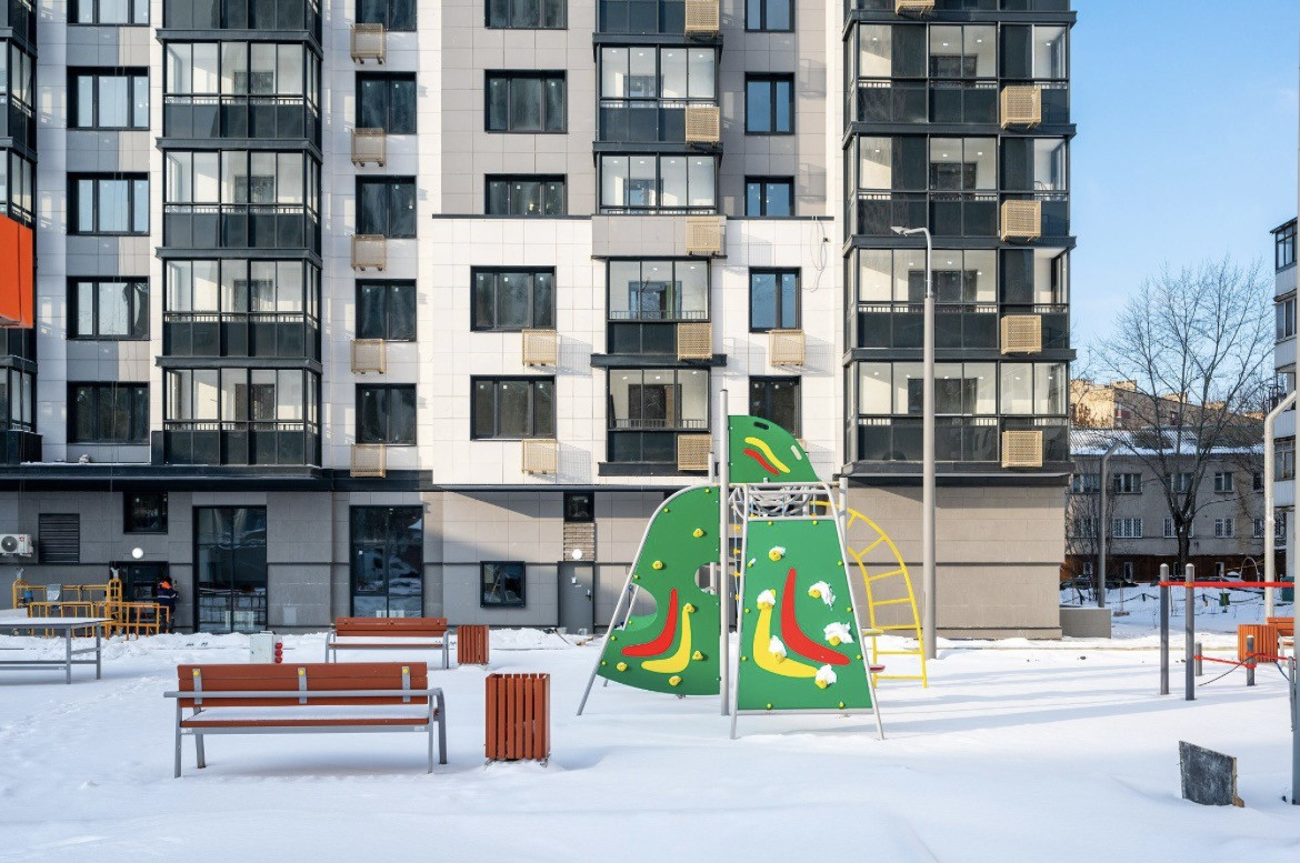 Двор без машин, с озеленением, есть камеры видеонаблюдения, постоянное освещение + есть детские и спорт площадки