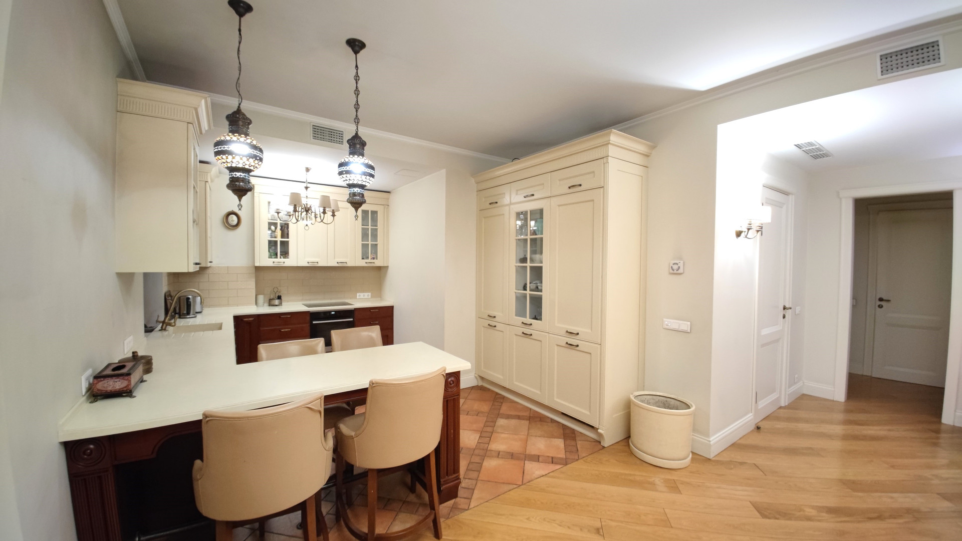 Мебель, в том числе кухонный гарнитур, изготовлена по индивидуальному заказу и доставлена из Италии.