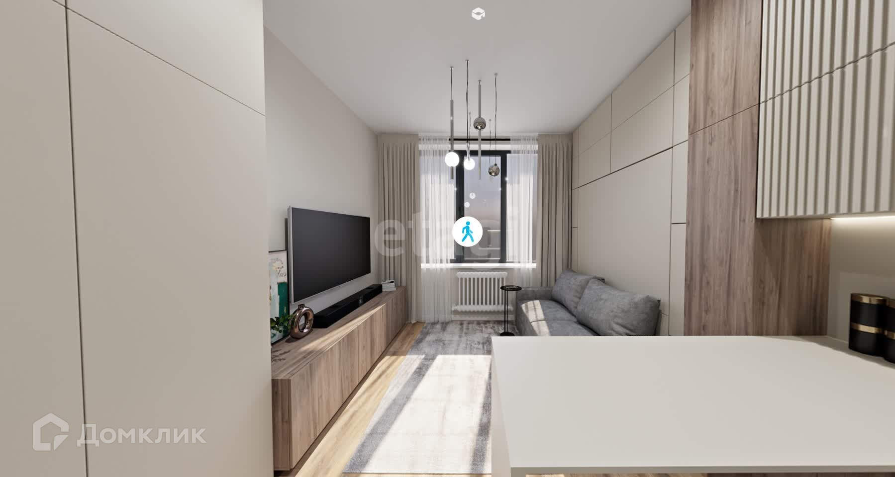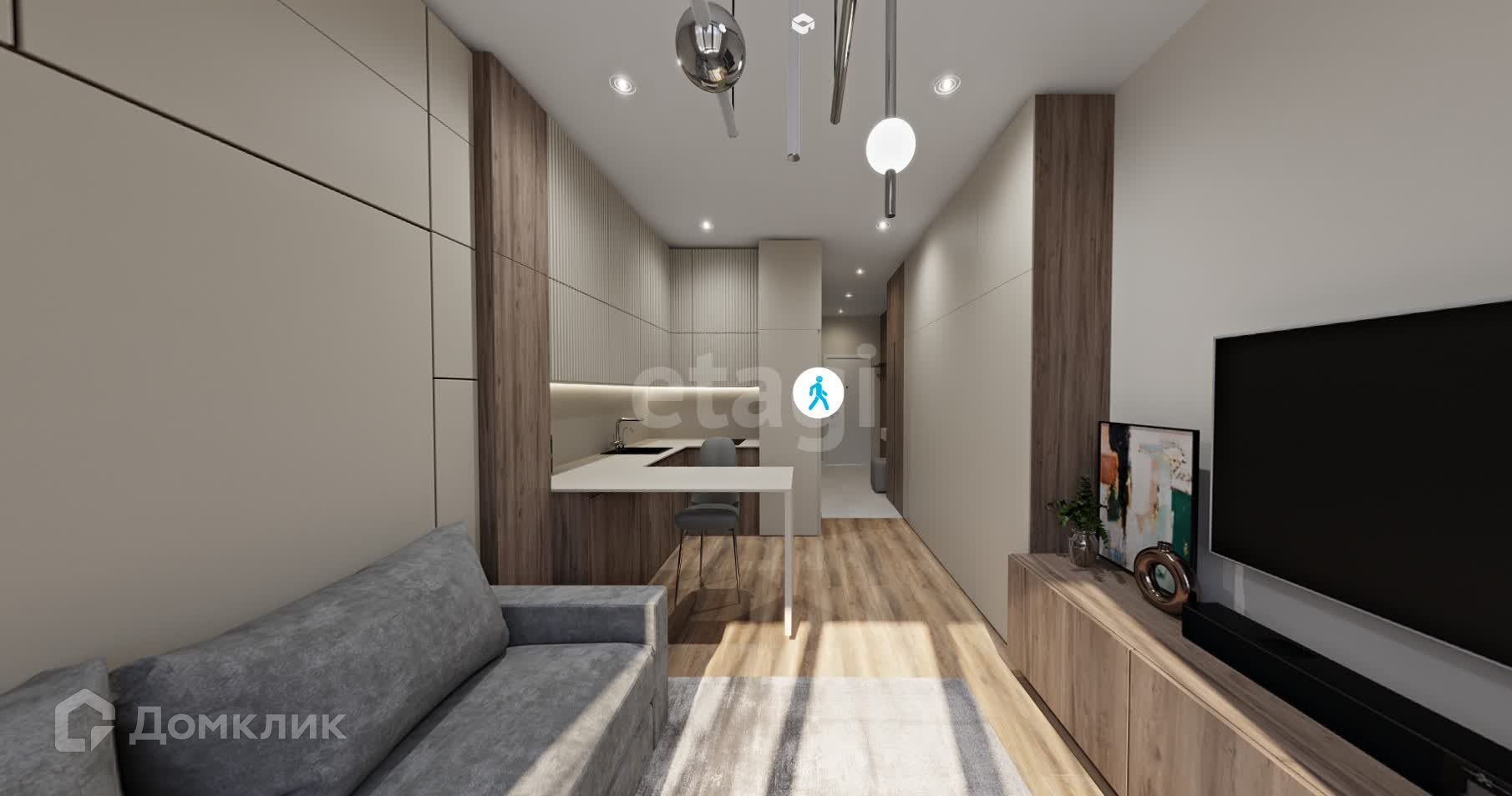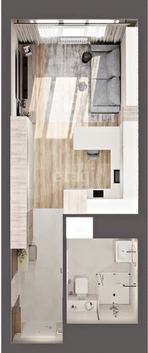 Студия зонирована: угловая кухня-ниша 5.1м и пространство для отдыха 12.5м.