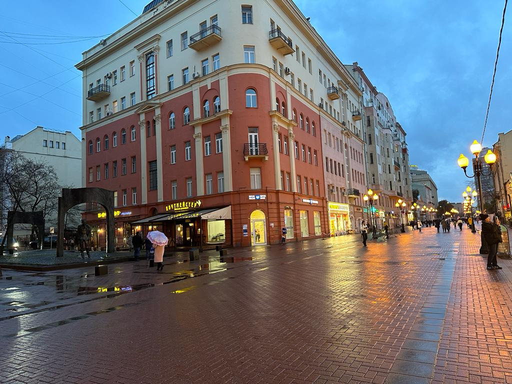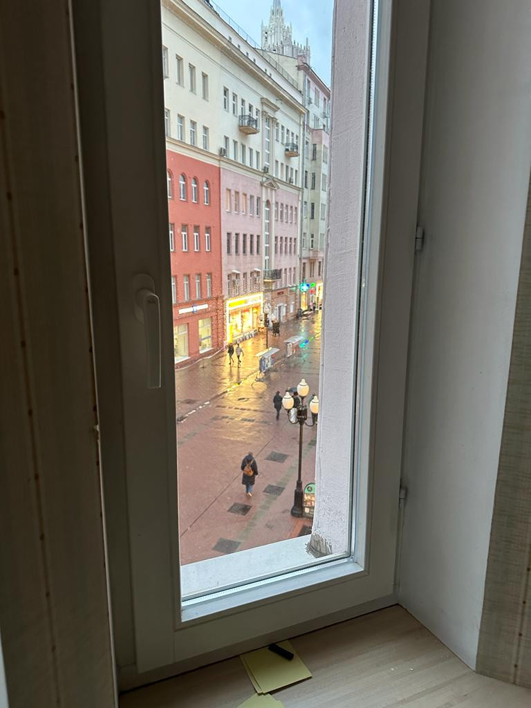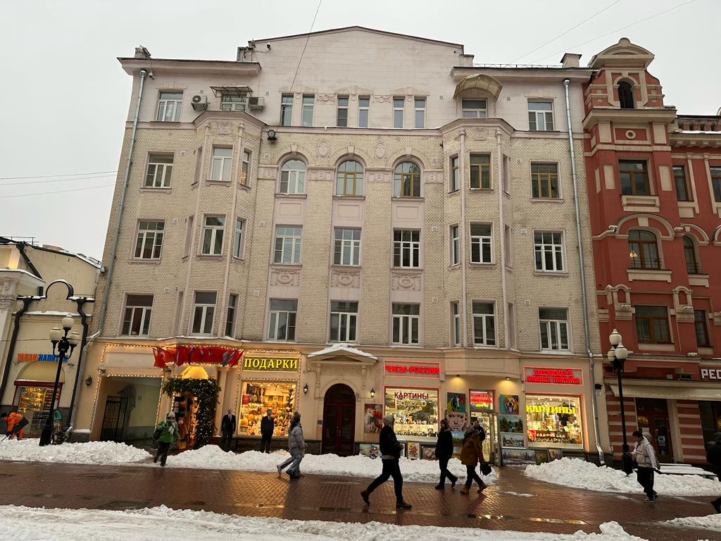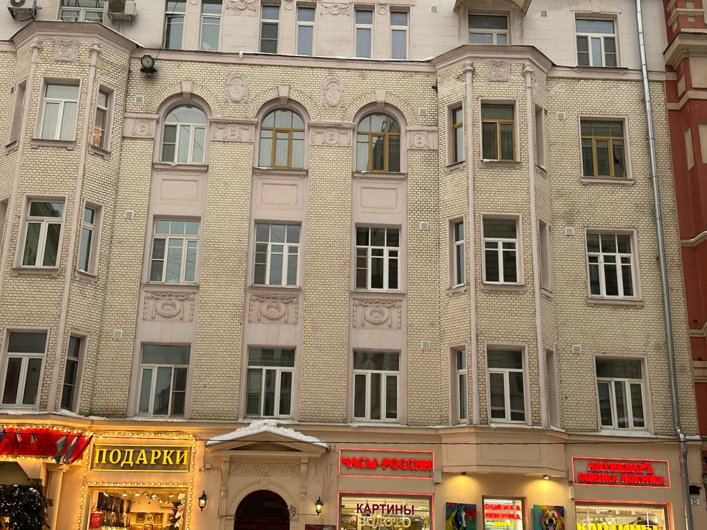 Пятикомнатная квартира в самом сердце Москвы, с выходом прямо на старый Арбат, в доходном доме 1910 года постройки.  Неподалёку расположен театр имени Е. Вахтангова дом-мастерская Константина Мельникова, множество музеев, магазинов, ресторанов. 3-й этаж. Окна на Арбат и во двор. Есть лифт, консьерж.
