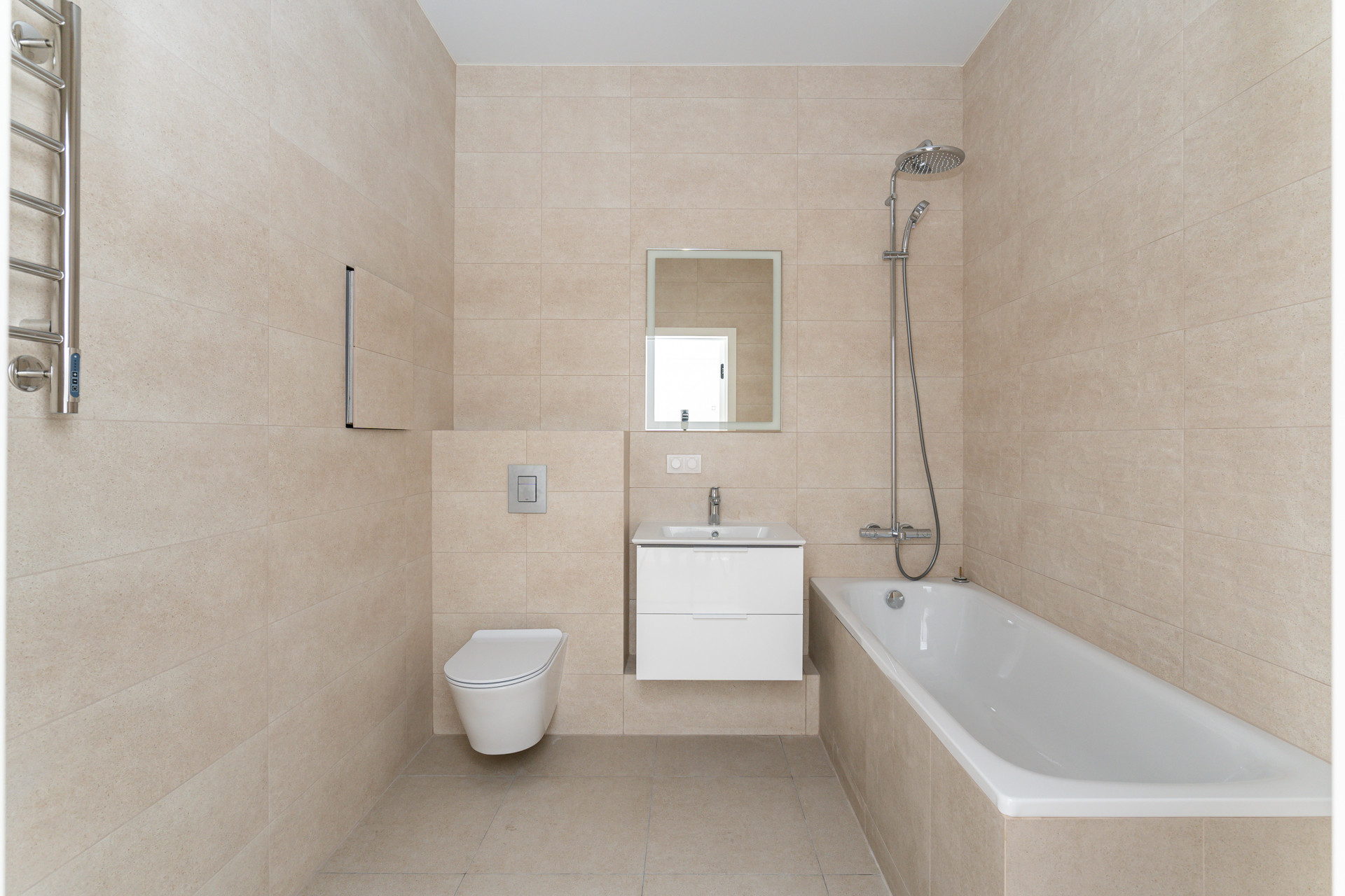 Функциональная планировка включает в себя просторную кухню-гостиную, три изолированные спальни, два санузла и большую гардеробную комнату. Ремонт выполнен в теплых тонах, которые создают атмосферу домашнего уюта. Кухонный гарнитур выполнен в светлых оттенках, оснащен всей необходимой техникой: холодильником, духовым шкафом, варочной поверхностью, стиральной и посудомоечной машинами. Вам останется только добавить в интерьер свою мебель и аксессуары.