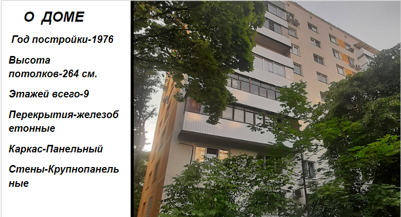 ДОМ – 1976 года постройки, типовая серия I-515/9М, 9 этажей, 4 подъезда, перекрытия железобетонные, каркас - панельный, стены – крупнопанельные, высота потолков 264см.