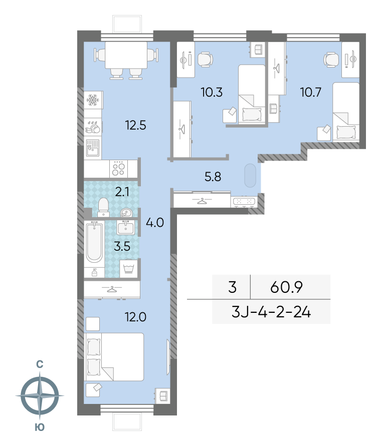 Общая площадь 60.9 м2