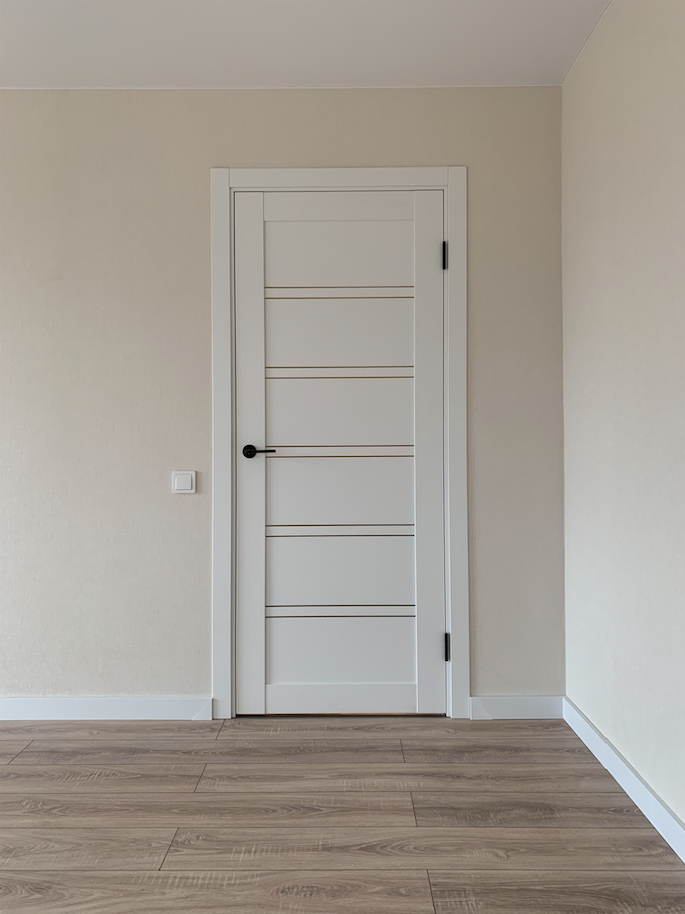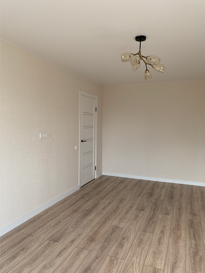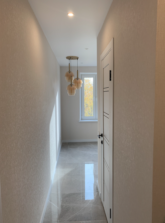 Зона коридора и кухня пол - керамогранит, комната ламинат