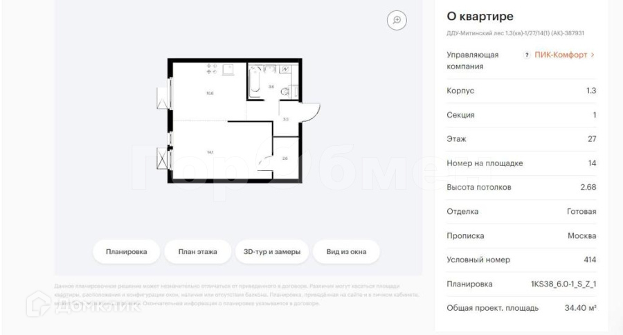 1-комнатная квартира, 35 м2, этаж 27 / 32, на продажу в Москве, жилой комплекс Митинский Лес, 1.3