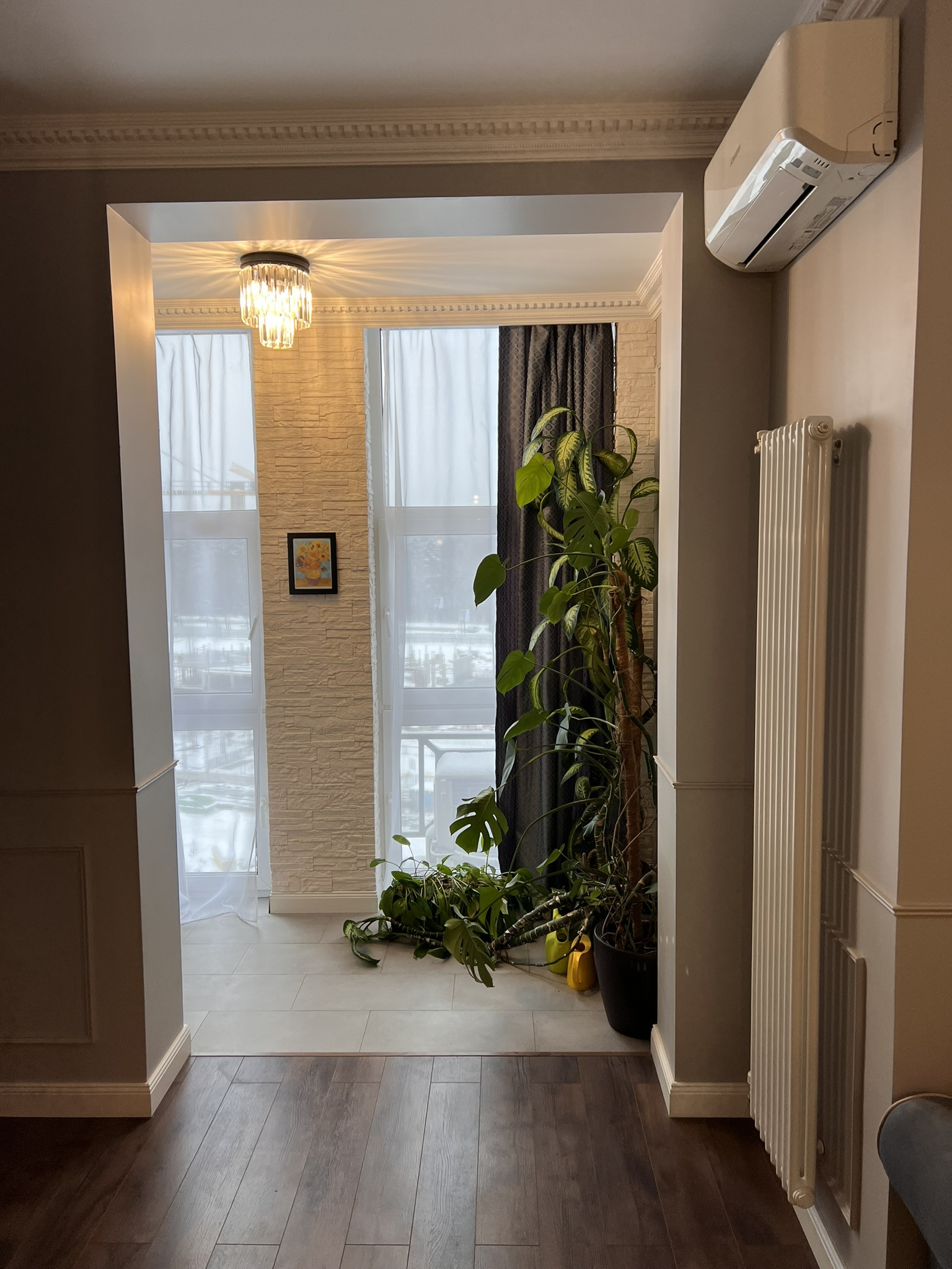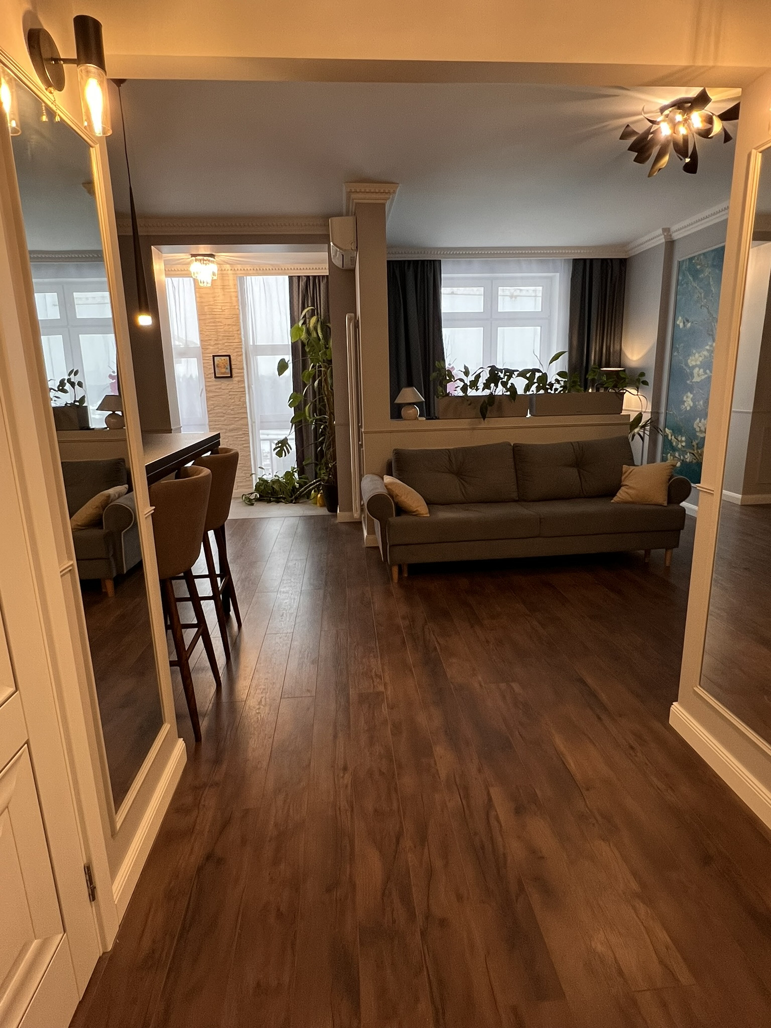 Студийная планировка с зонированием пространства, гардеробная, большой санузел, утепленный балкон с подогревом пола (используется как кабинет).  При желании, легковозводимыми перегородками можно сделать изолированную спальню.
