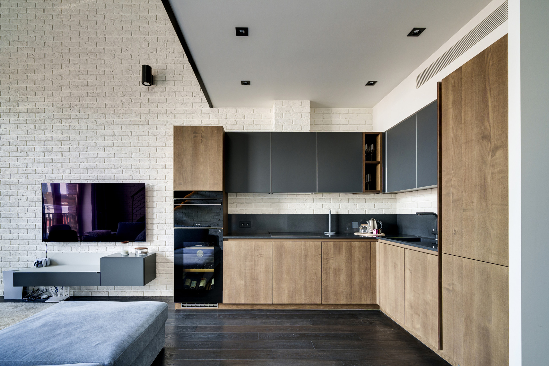 Первый уровень: площадь 45 м2, кухня-гостиная.