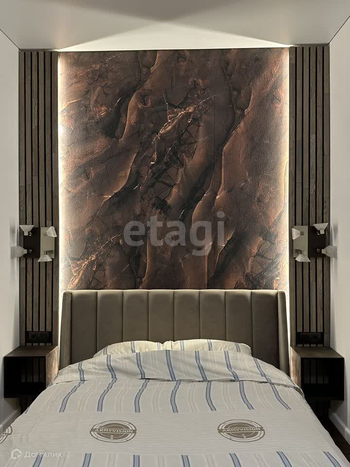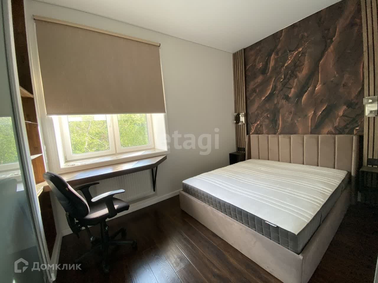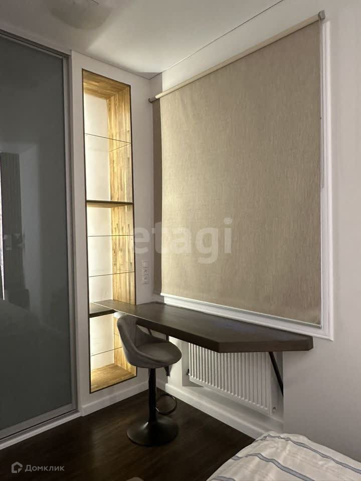 Уютная спальня: кровать с подъемным механизмом, удобное рабочее место, высокий шкаф-купе.