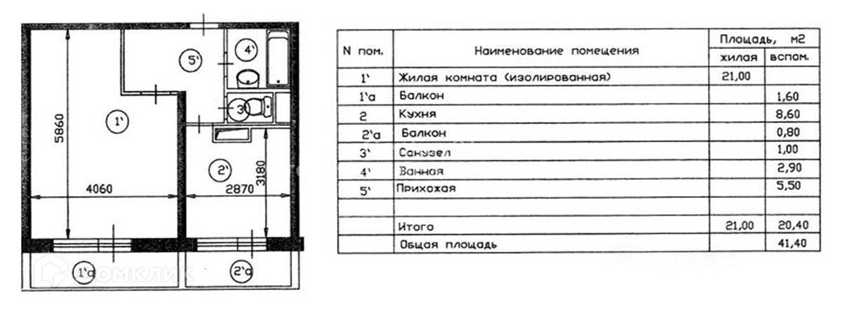Общая площадь 41.4 м2