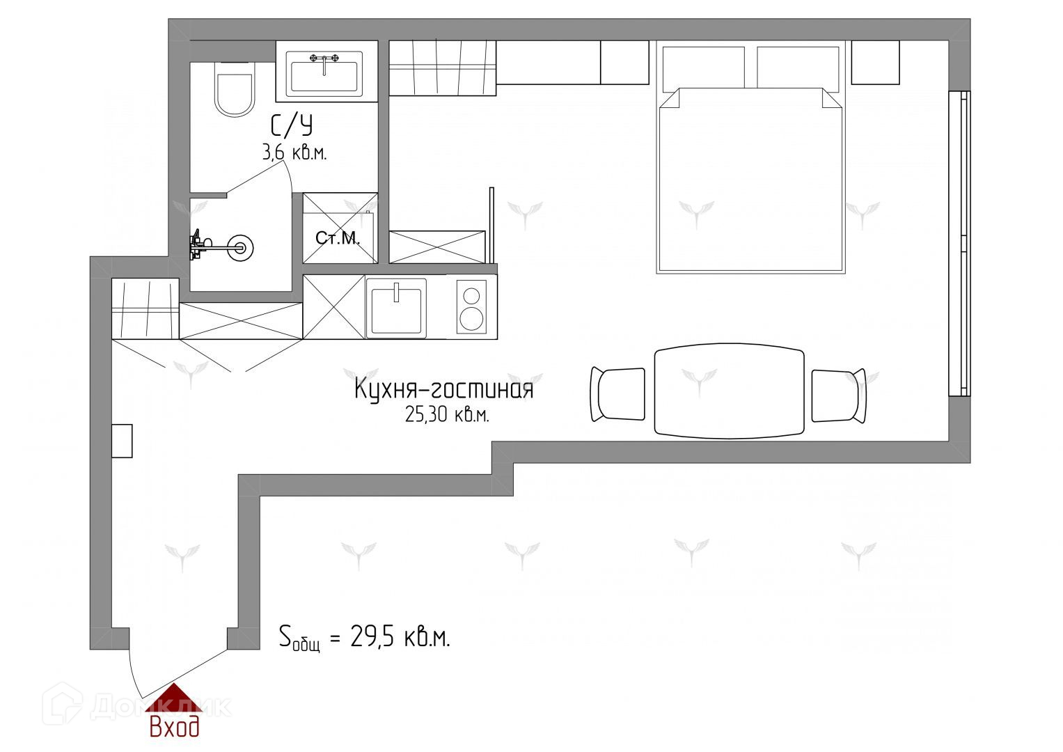 Общая площадь 29.5 м2