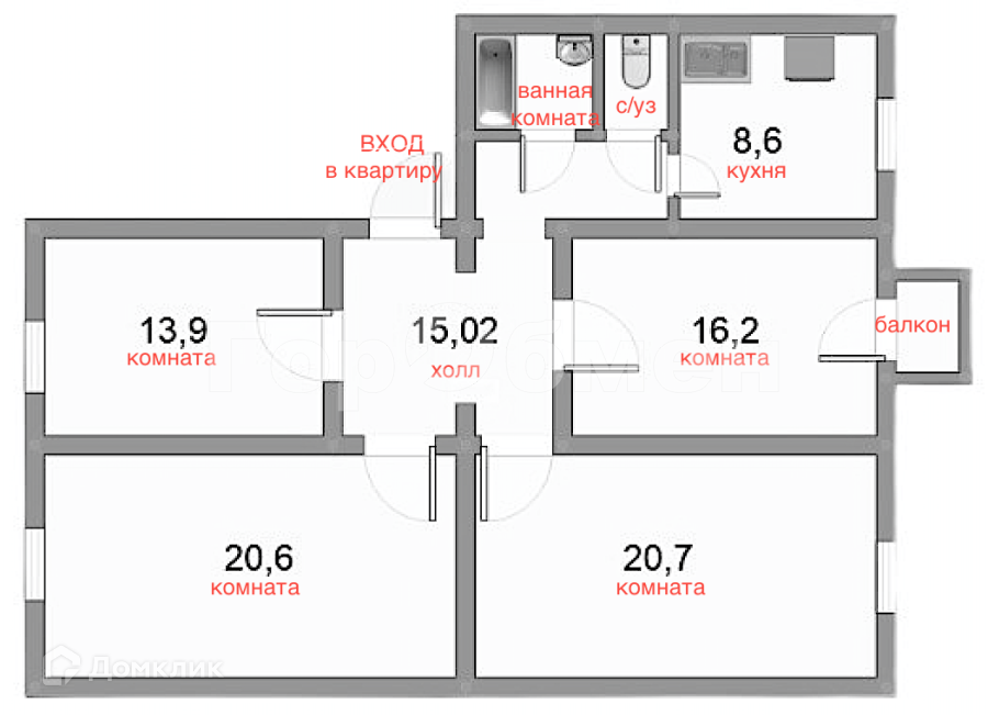 Все комнаты изолированные: 20,6+20,7+13,9+16,2 кв.м, кухня-8,6 кв.м, санузел раздельный, большой холл- 15 кв.м. Есть небольшой балкон. Лифта нет.