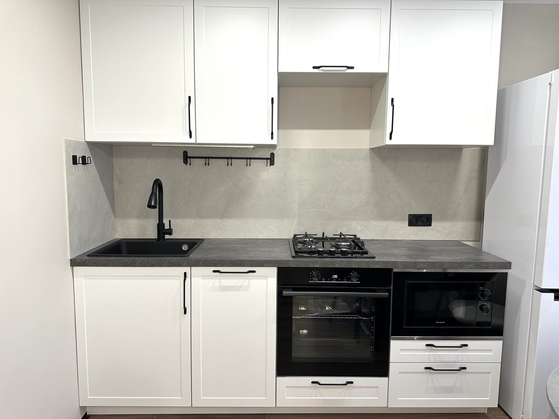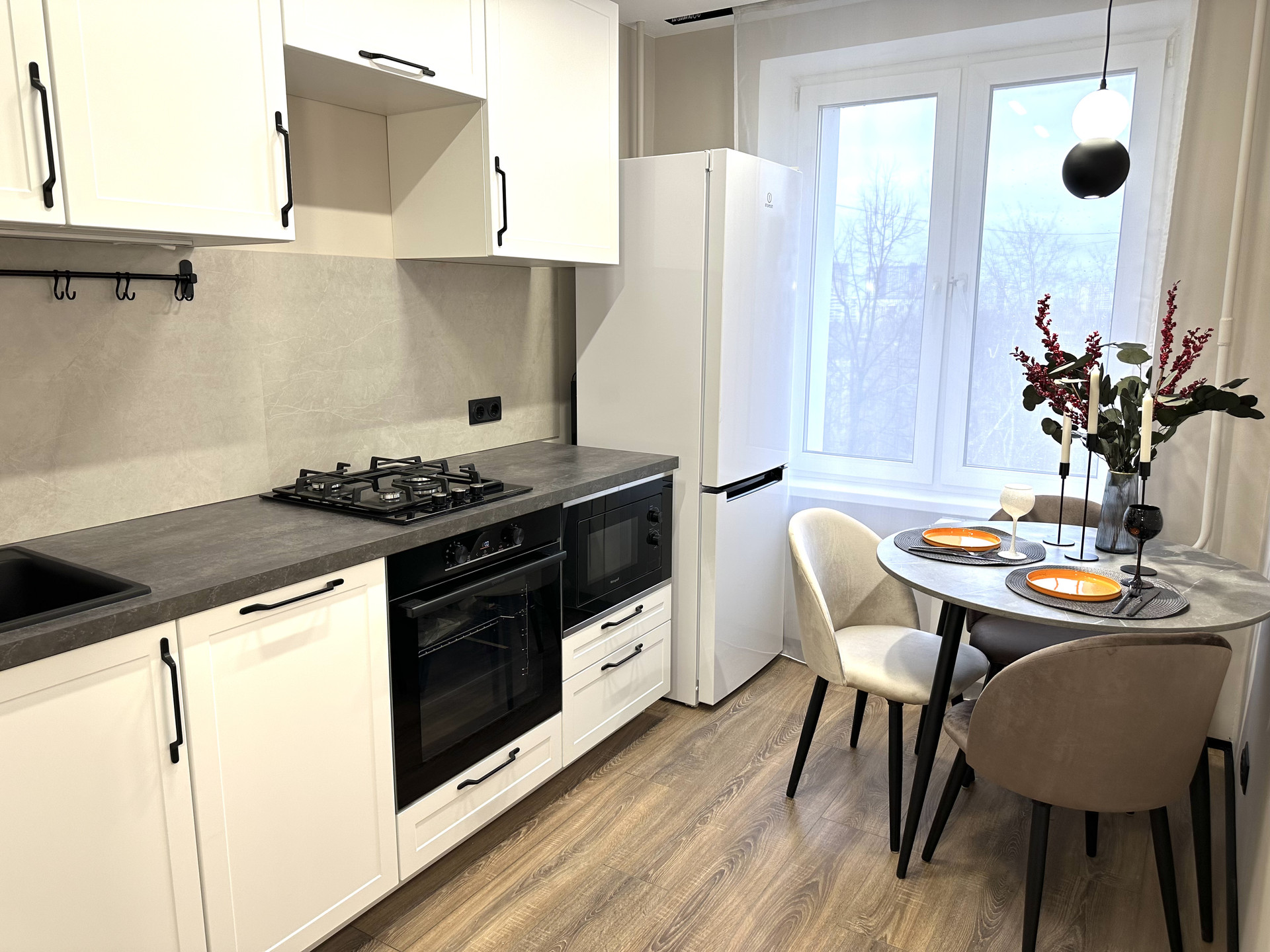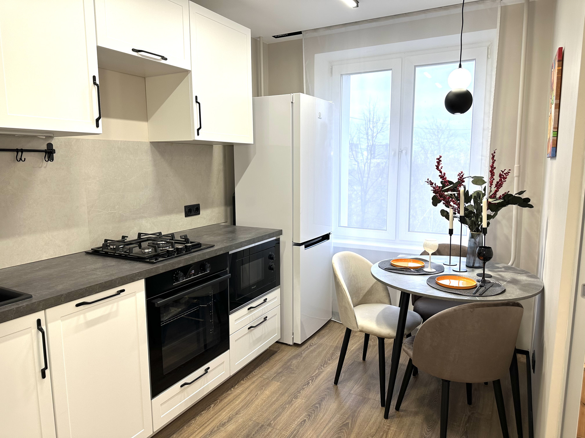 Встроенная в современном стиле кухня полностью оснащена  бытовой техникой : холодильник No frost, духовой шкаф, варочная панель, встроенная микроволновая печь, посудомоечная машина.