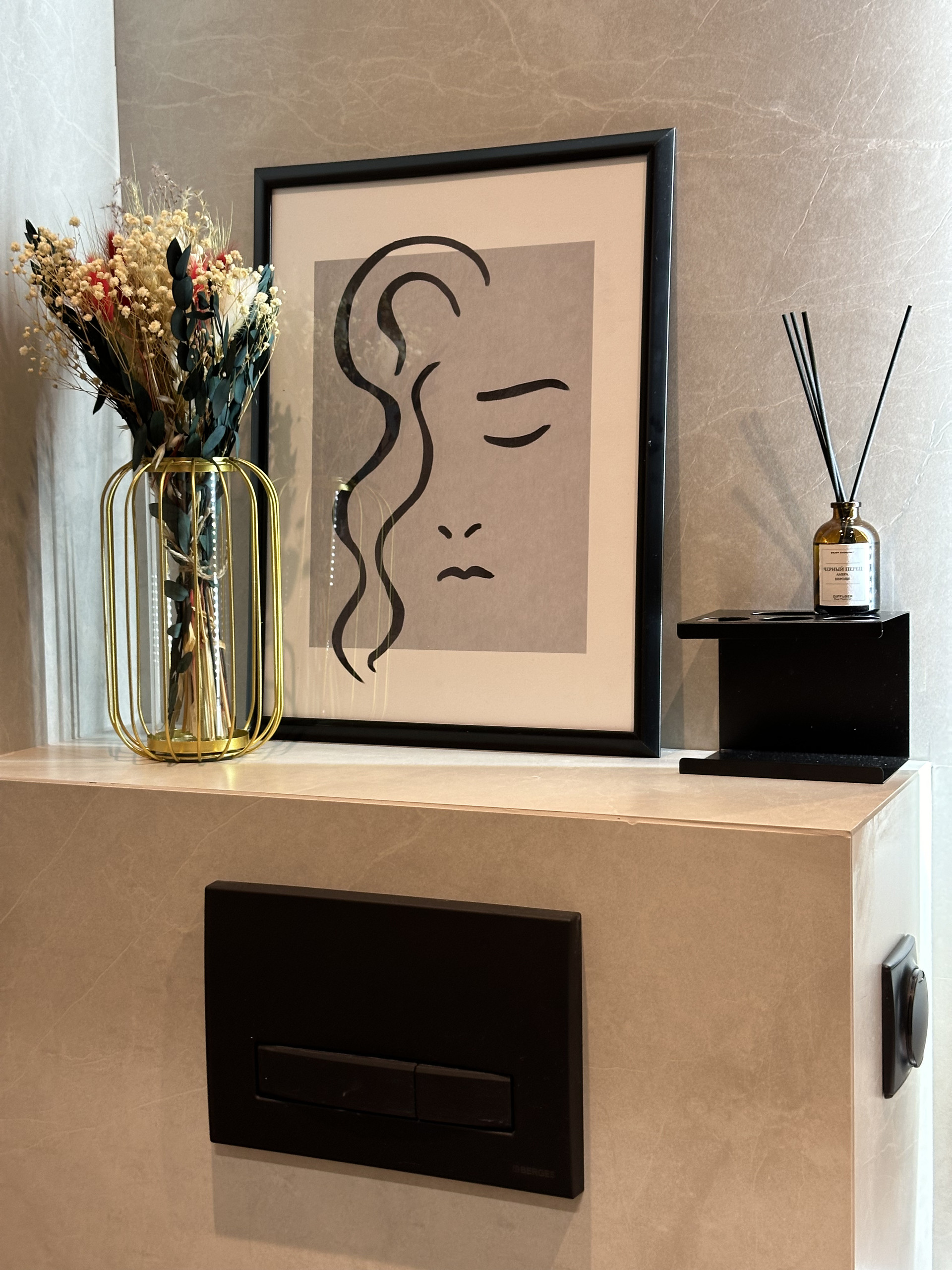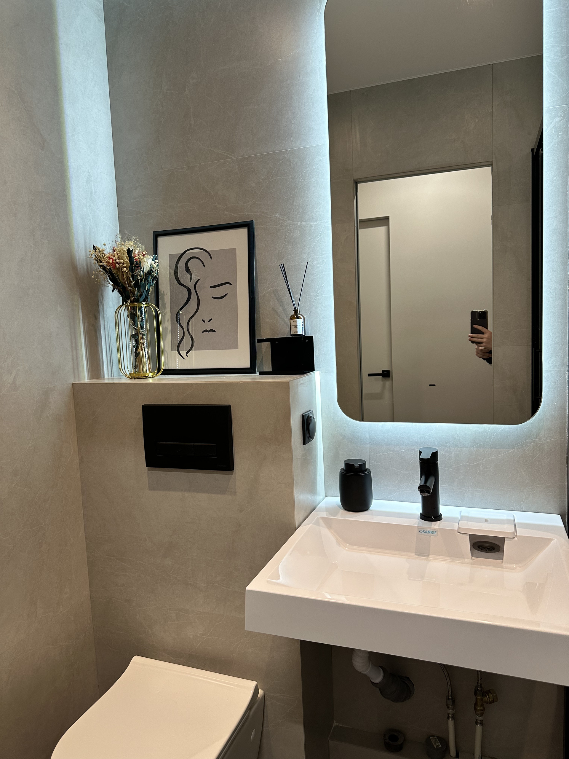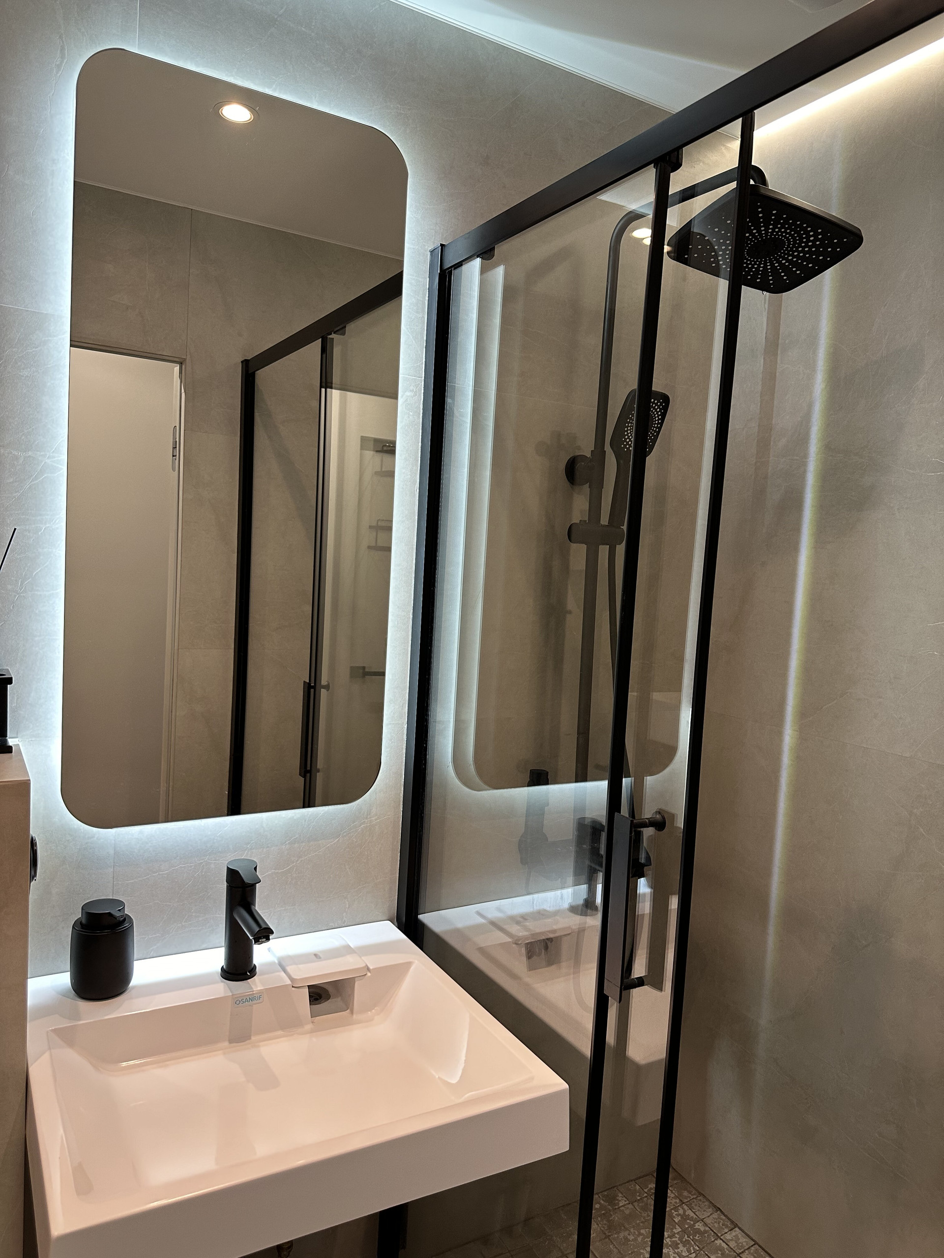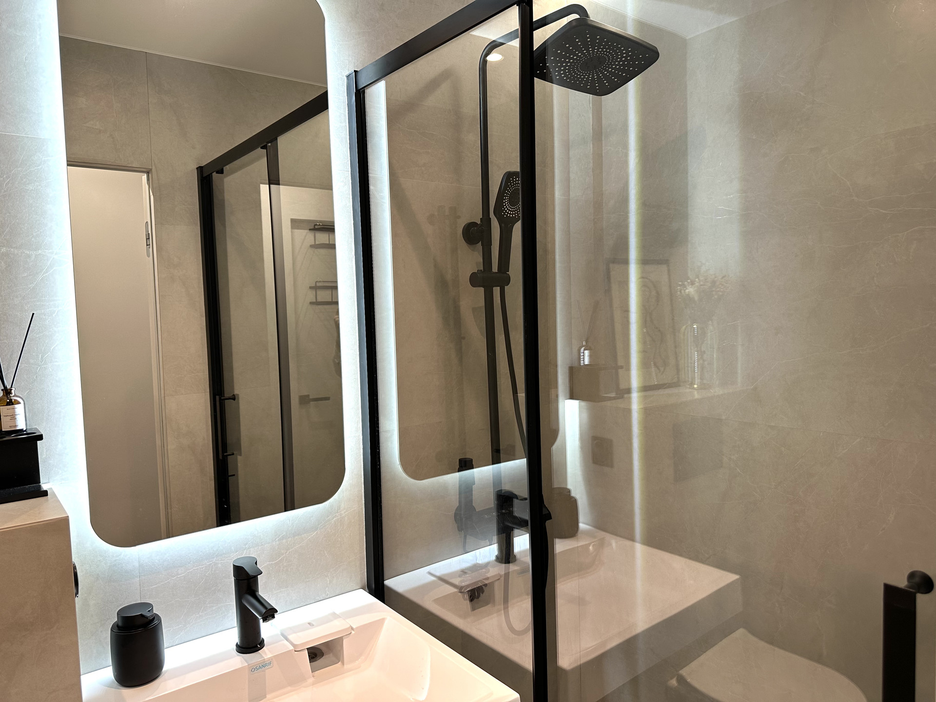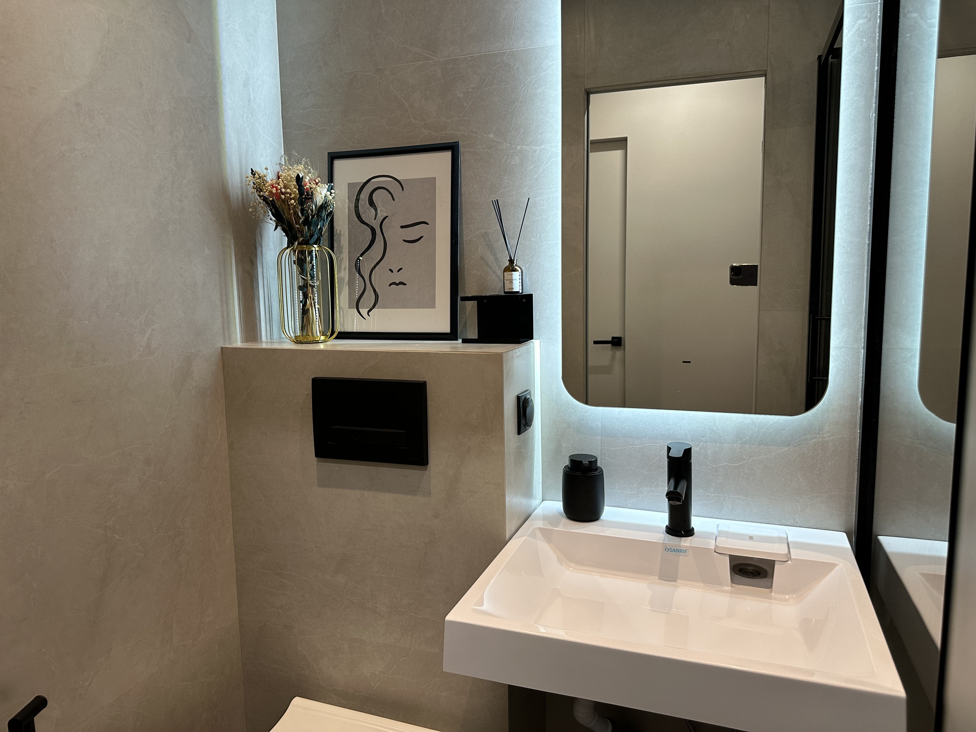 В сан/узле хорошая сантехника, встроенная инсталляция с безободковым унитазом и раковина, подключена также душевая система с тропическим душем.