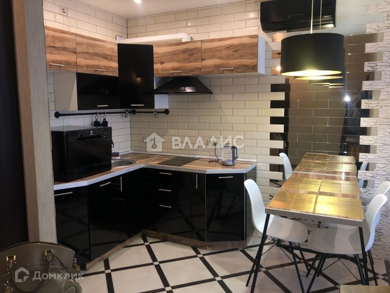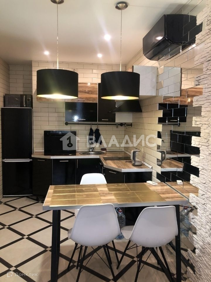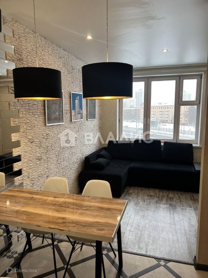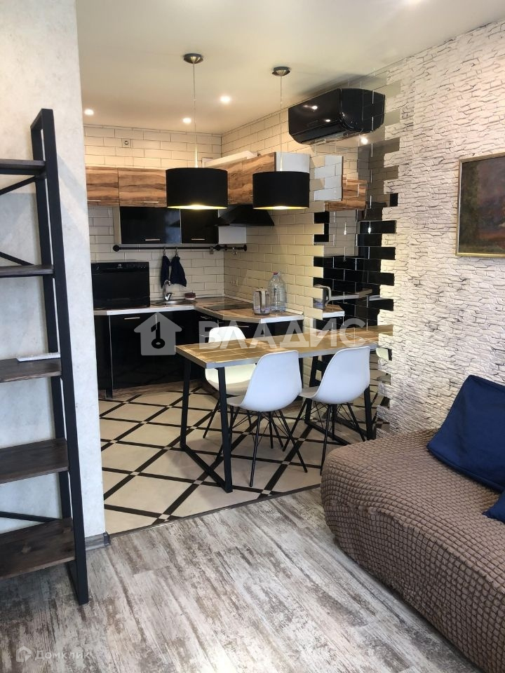Встроенная кухня. СВЧ с функцией духового шкафа. Посудомоечная машина. Стол-стойка в стиле лофт. Плита стеклокерамика. В гостиной большой раскладывающийся угловой диван. Высокий стеллаж.