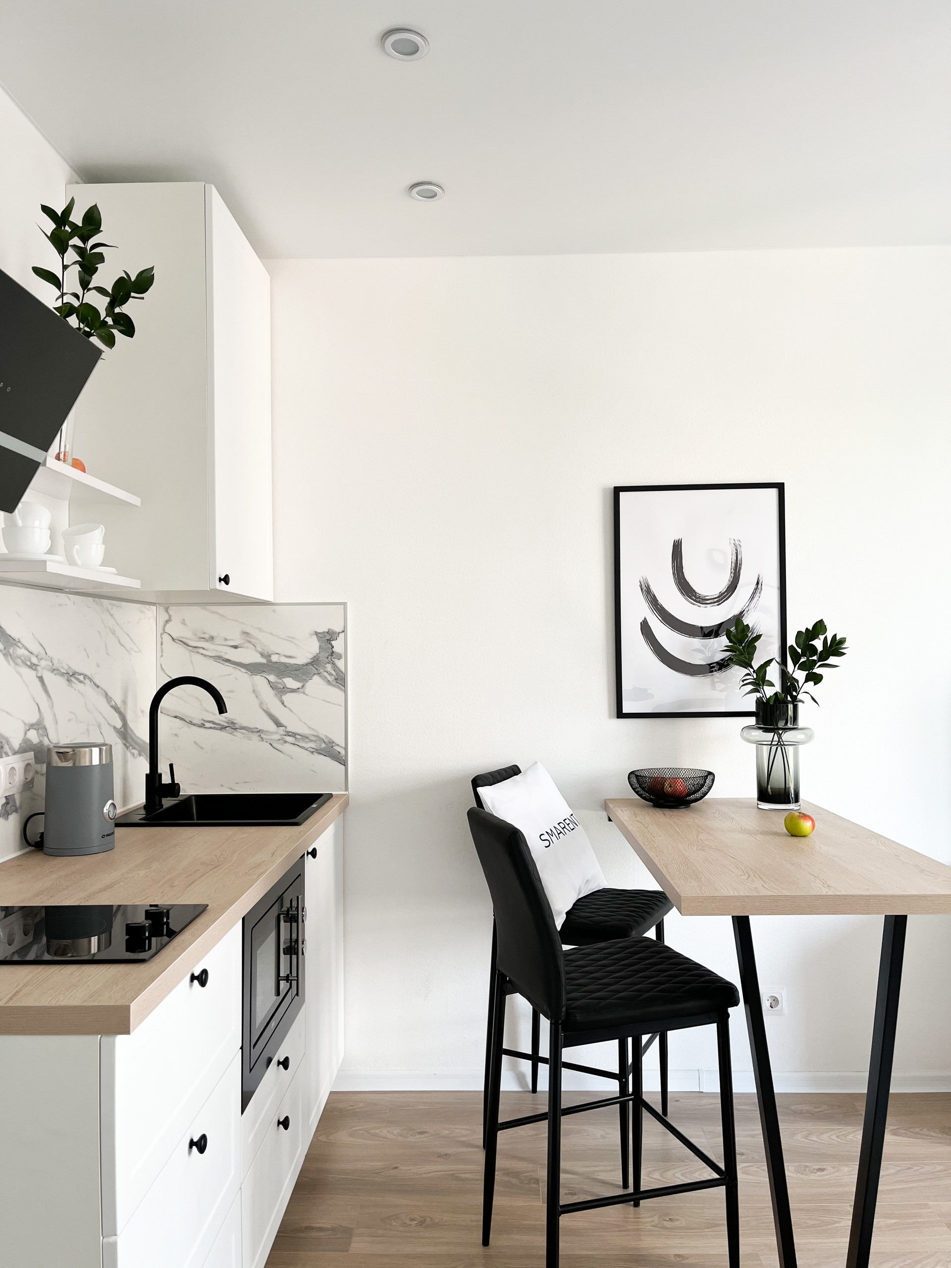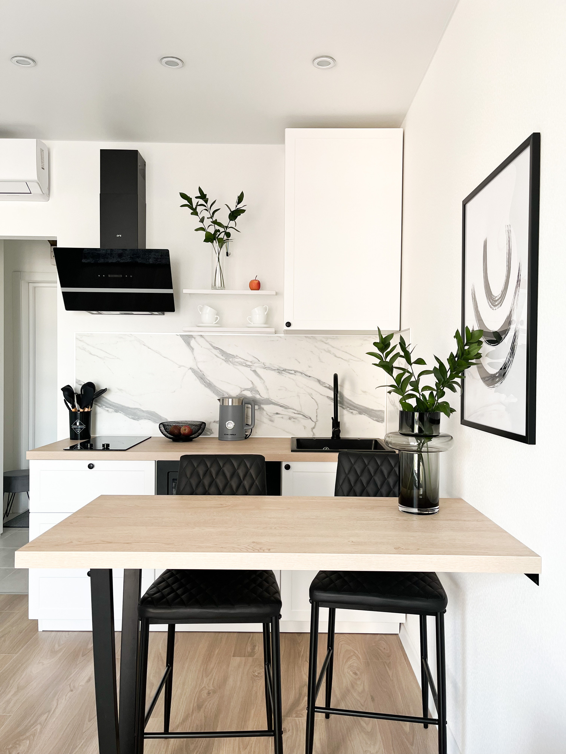 Бытовая техника: стиральная машина, холодильник, вытяжка, варочная панель, телевизор, электрический чайник.