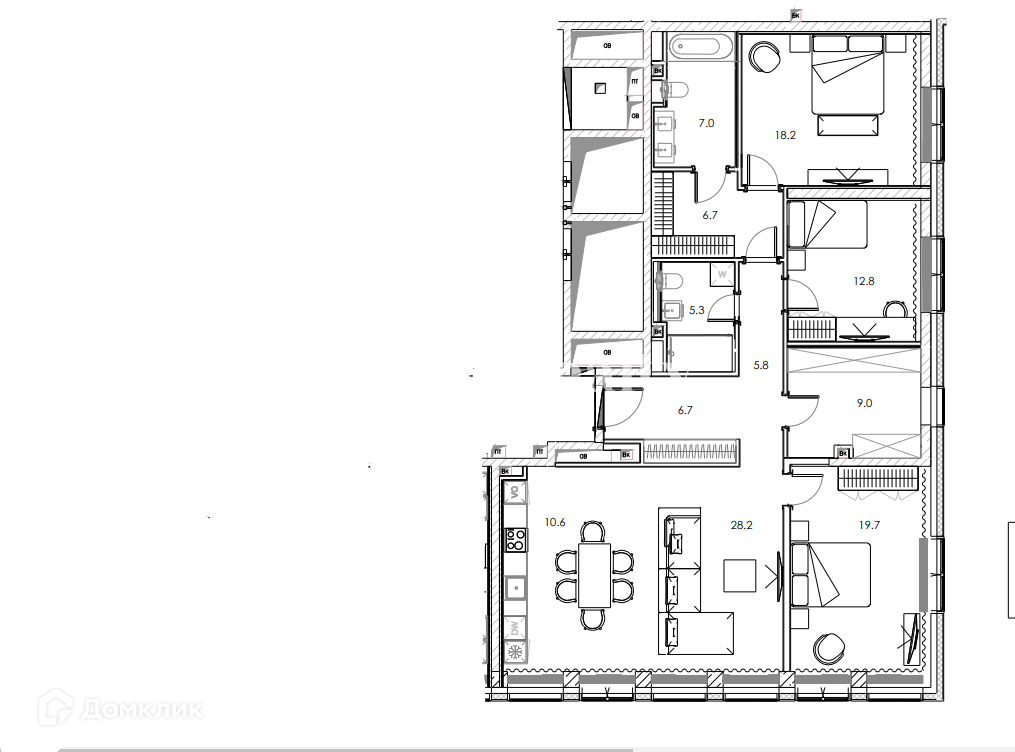 В квартире выполнена дизайнерская отделка в светлых лаконичных тонах. Спланирована кухня-гостиная, мастер-спальня с собственной ванной и гардеробной, детская комната,кабинет,вторая спальня, санузел с душевой, прихожая с гардеробной.