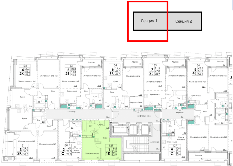 Общая площадь 32.9 м2