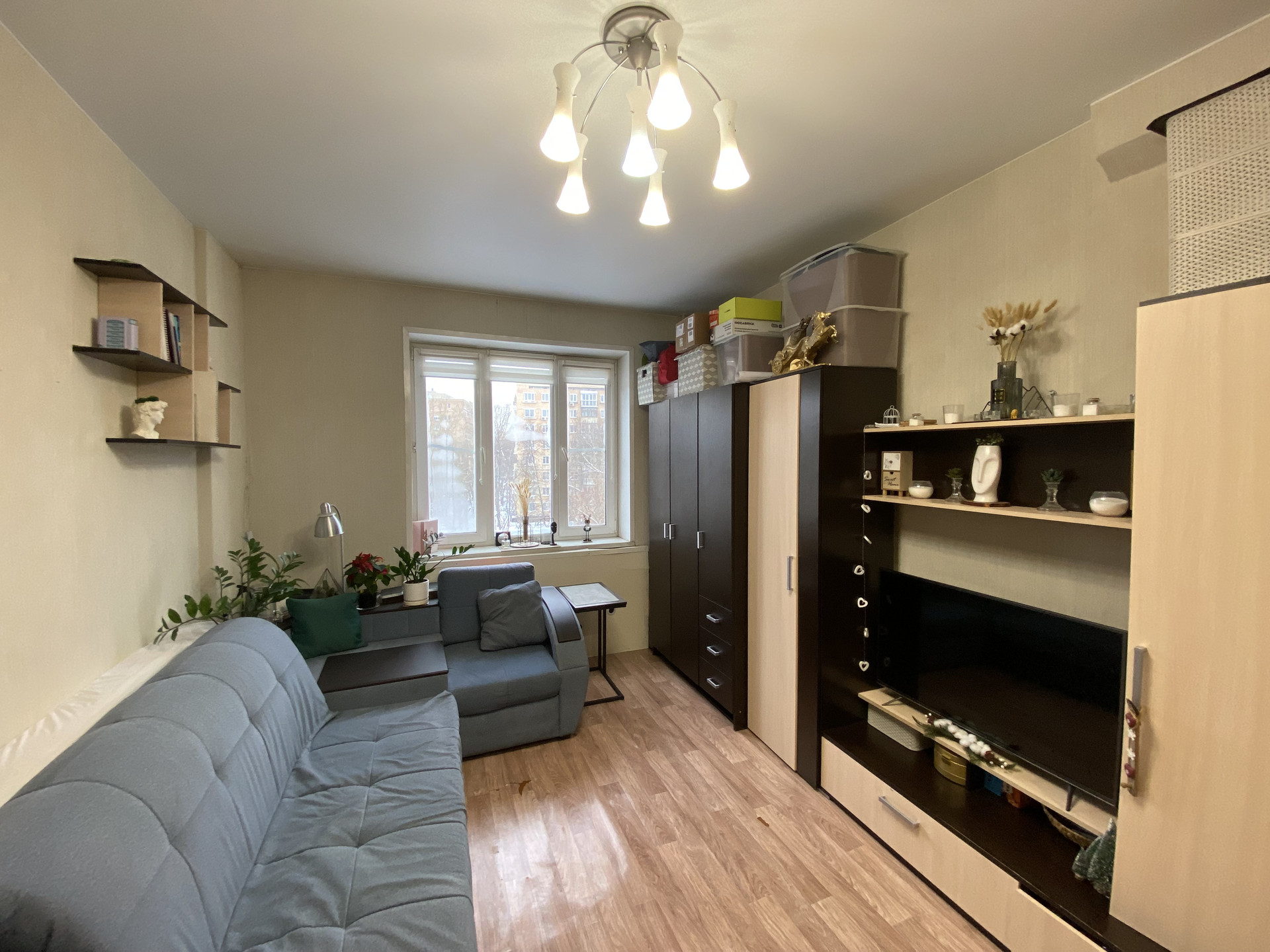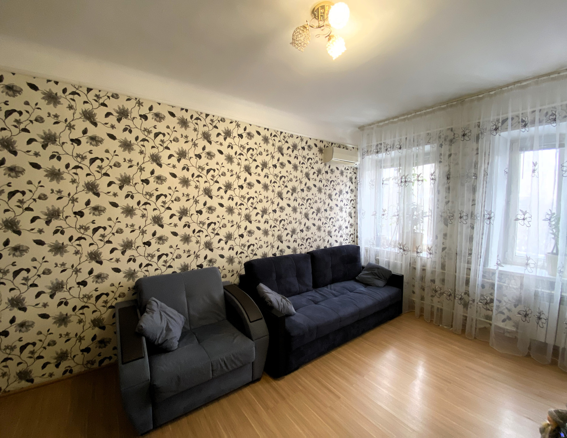 Первая комната, гостиная, имеет площадь 20,2 квадратных метра и оборудована большим диваном, журнальным столиком и телевизором. Здесь удобно принимать гостей или собираться всей семьей.
