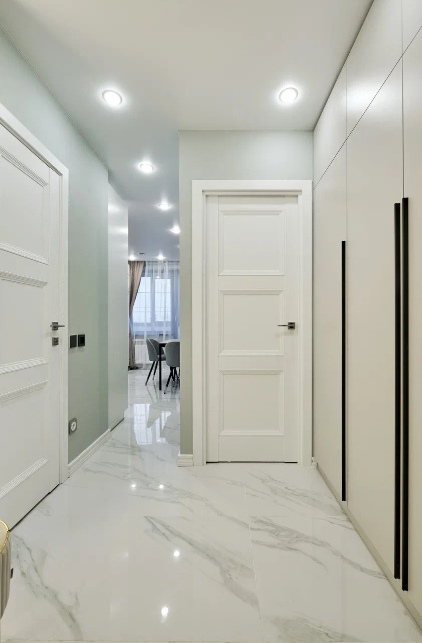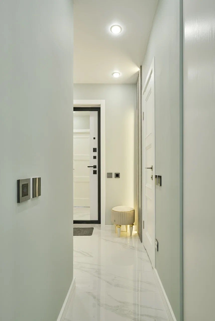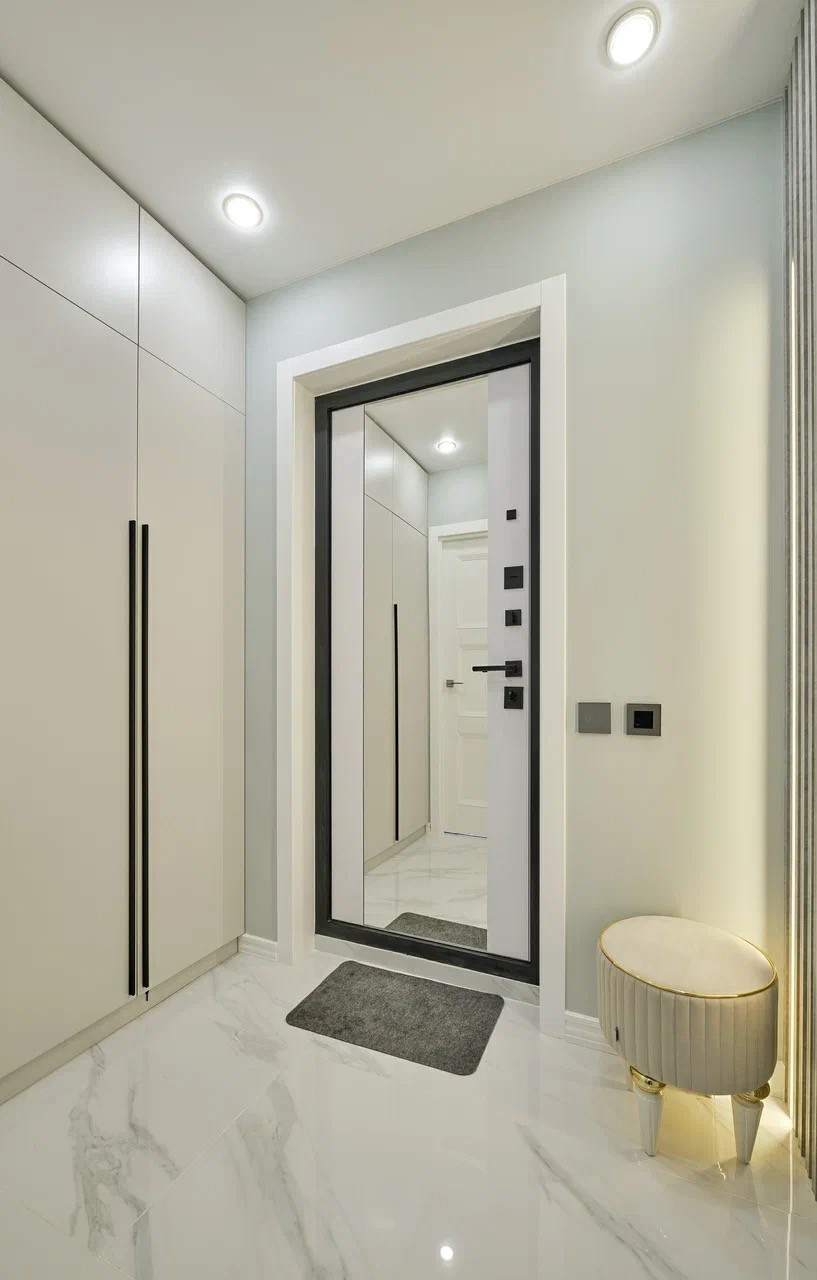Коридор: входная дверь с зеркалом и отделкой мдф с двух сторон, вместительный шкаф, пуф. Полы- керамогранит Испания с подогревом, стены краска, часть стены из реек с подсветкой.