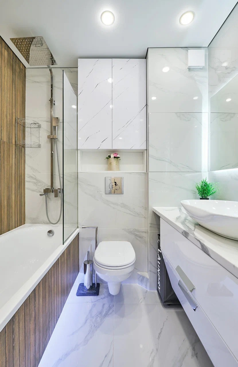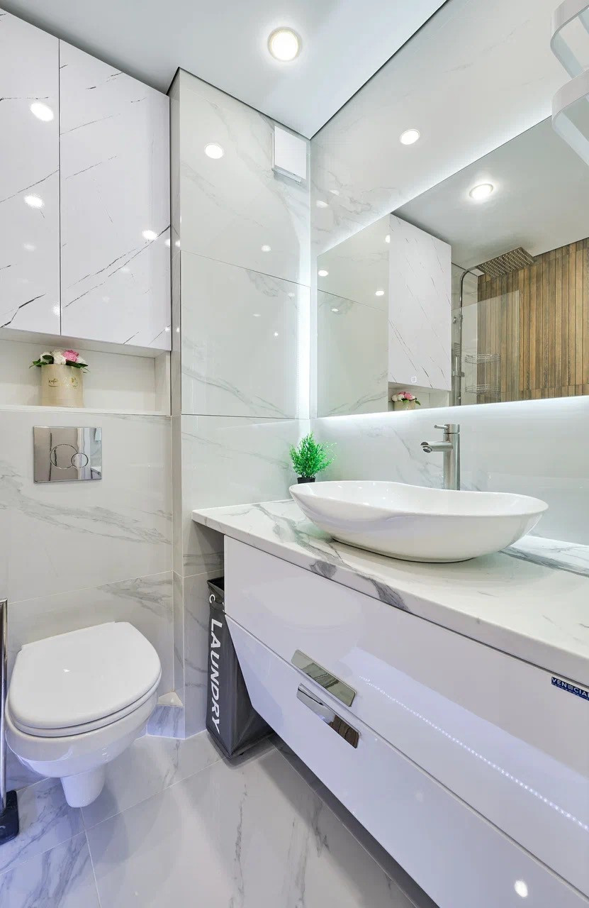 Санузел: парящий потолок, ванная, инсталляция с унитазом, раковина, тумба, полотенцесушитель, смесители, корзина для белья, шкаф над инсталляцией. Стены и пол-Керамогранит Испания+керамогранит под дерево. Парящая ванна с подсветкой, Пол с подогревом. Скрытый люк для доступа к коммуникациям и счетчикам.